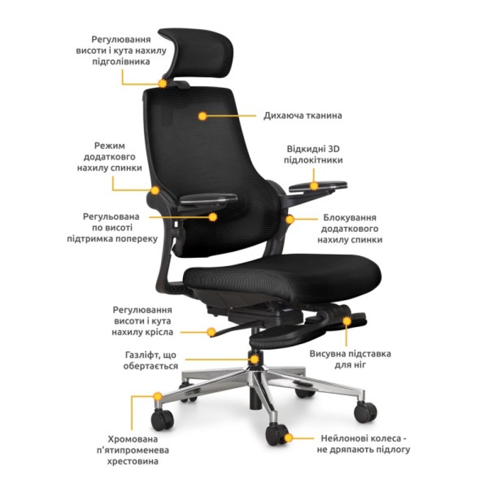 Додаткова регульована підтримка поперекового відділу допомагає уникнути напруження та забезпечити правильне положення спини при тривалому сидінні. Можливість регулювання підтримки попереку сприяє збереженню здоров'я хребта та створює комфортні умови для різного виду діяльності