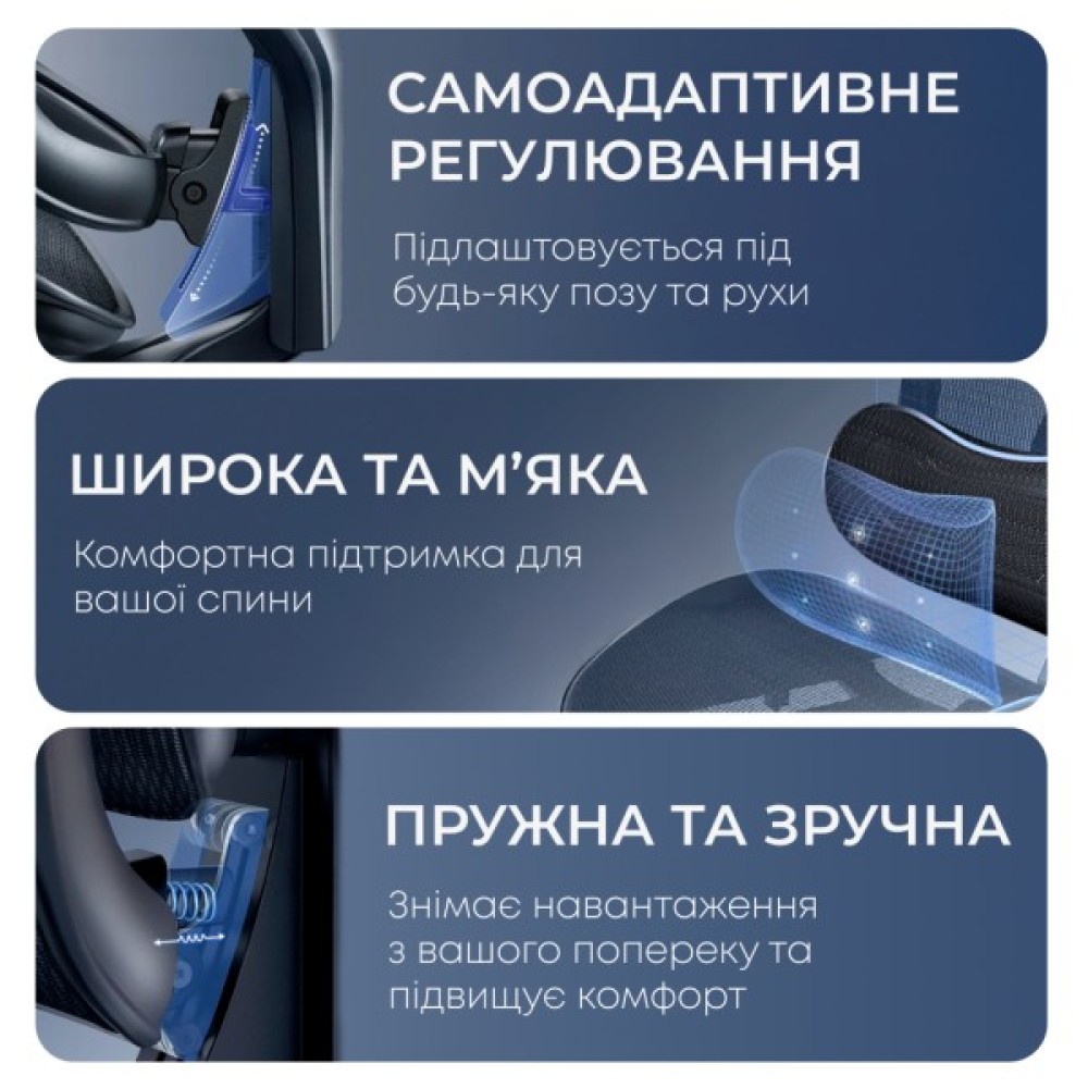 • Автоматична підтримка попереку: підлаштовується під рух користувача, забезпечуючи постійну опору спині.