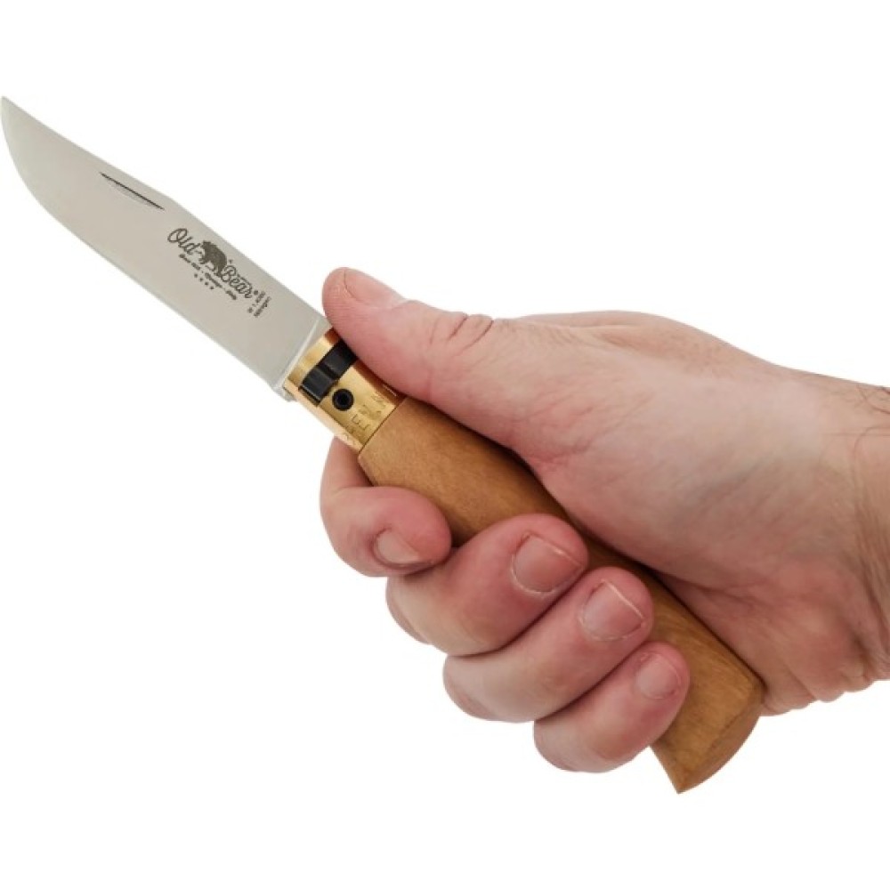 Клинок профілю Clip Point виготовляється з нержавіючої сталі Aisi 420 або вуглецевої сталі C70, залежно від моделі. Ці типи сталі ідеально підходять для такого типу ножів та легко правляться навіть в польових умовах. В робоче положення клинок приводиться нігтьовою виїмкою та фіксується поворотом спеціального кільця в передній частині руків'я. Сам виробник називаю цю систему “Brass with locking”, що є похідним від замку Virobloc. Відкритий осьовий гвинт під 8 Torx зручно регулюється комплектним ключем. На клинок нанесено витравлений сіллю логотип “Old Bear”.