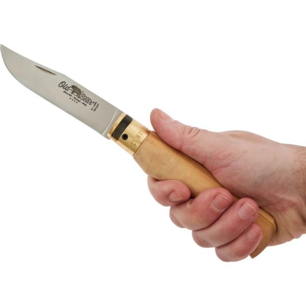 Клинок профілю Clip Point виготовляється з нержавіючої сталі Aisi 420 або вуглецевої сталі C70, залежно від моделі. Ці типи сталі ідеально підходять для такого типу ножів та легко правляться навіть в польових умовах. В робоче положення клинок приводиться нігтьовою виїмкою та фіксується поворотом спеціального кільця в передній частині руків'я. Сам виробник називаю цю систему “Brass with locking”, що є похідним від замку Virobloc. Відкритий осьовий гвинт під 8 Torx зручно регулюється комплектним ключем. На клинок нанесено витравлений сіллю логотип “Old Bear”.