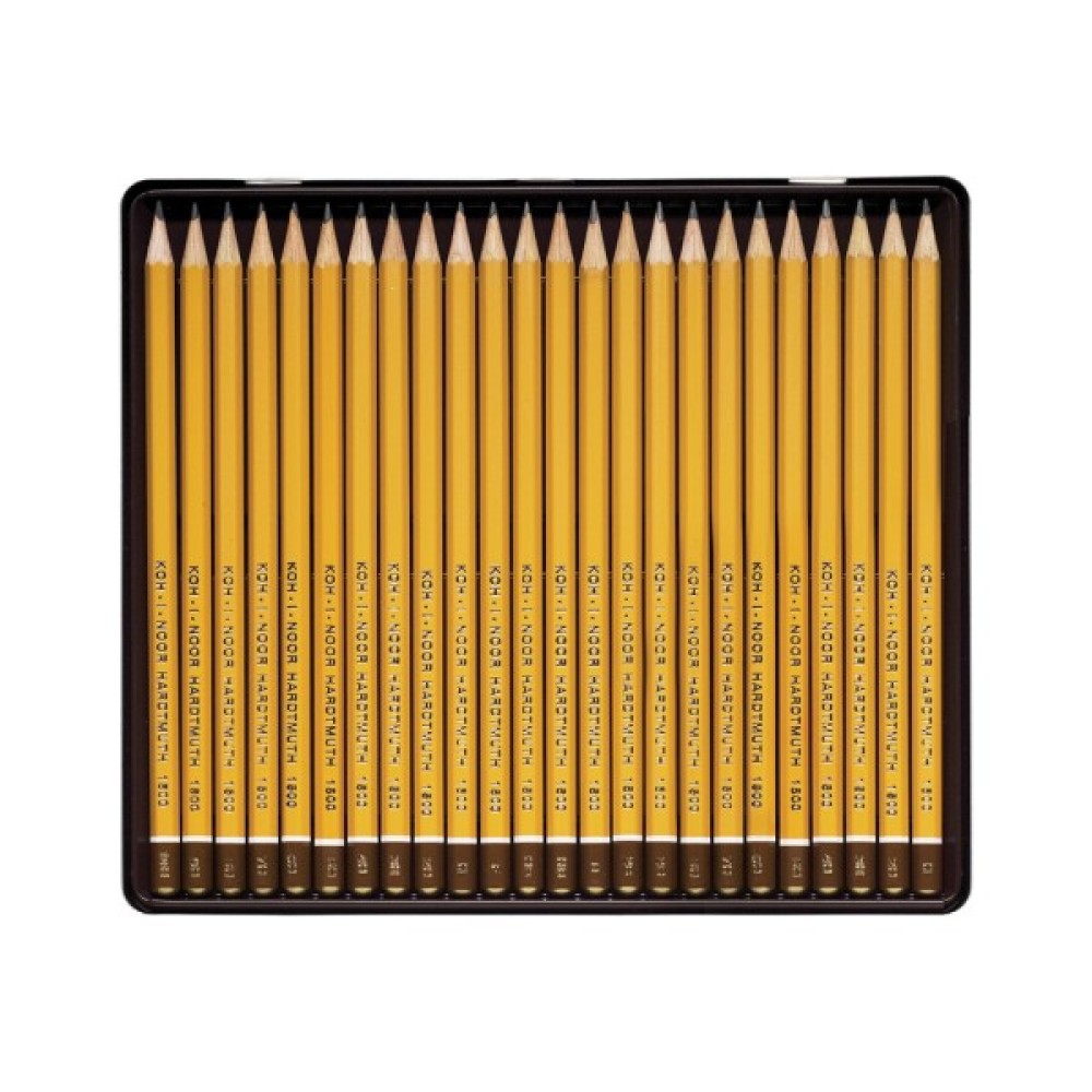 Графітні шестигранні олівці Koh-i-Noor в подарунковому металевому пеналі. Інструменти з професійного набору вирізняються високою якістю. Кожен виріб забезпечений міцним дерев'яним корпусом для захисту стрижня від механічних пошкоджень. Грифель не кришиться й не ламається під час використання.