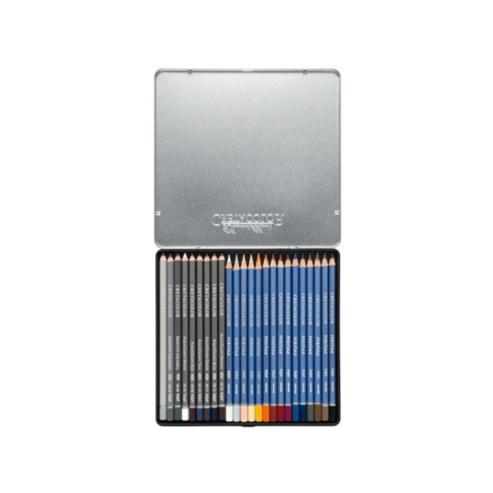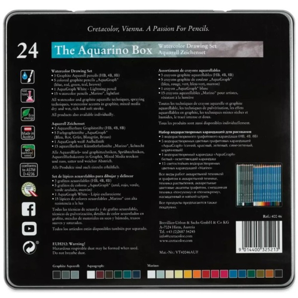 Набір водорозчинних олівців THE AQUARINO BOX, 24шт., мет.кор., Cretacolor (400 46)Набір "The Aquarino Box" у металевій коробці з яскравим малюнком на металевій поверхні.У наборі високоякісні художні матеріали:- акварельні олівці "Marino" - 15 шт.- графітові водорозчинні олівці – 3 шт. HB, 4B, 8B- AquaGraph водорозчинні кольорові графітові олівці – 6 шт.Художні акварельні олівці «Marino» найвищого рівня якості захоплюють яскравістю своїх кольорів, м'яким шрихом. Світлостійкість - якість класу "преміум" - категорії 1 LF1) та 2 LF2.Особливі властивості виявляються при розмиванні їх водою: чисті лінії перетворюються на м'які переходи, всі кольори добре змішуються, даючи тим самим нескінченну кількість відтінків.Акварельні олівці мають круглий корпус, діаметр 7,5 мм; стрижень – 3,8 мм.Водорозчинні графітові олівці мають шестигранний корпус, діаметр 7,5 мм; стрижень – 3,8 мм. Твердість – HB, 4B, 8B.Завдяки насиченому та м'якому штриху графітних кольорових олівців AquaGraph ви можете досягти сміливих акцентів акварельної фарби у графітових малюнках, розмивши їх водою.Методи: техніка розпилення, акценти акварельної фарби у графіті, змішані техніки – сухі та вологі.