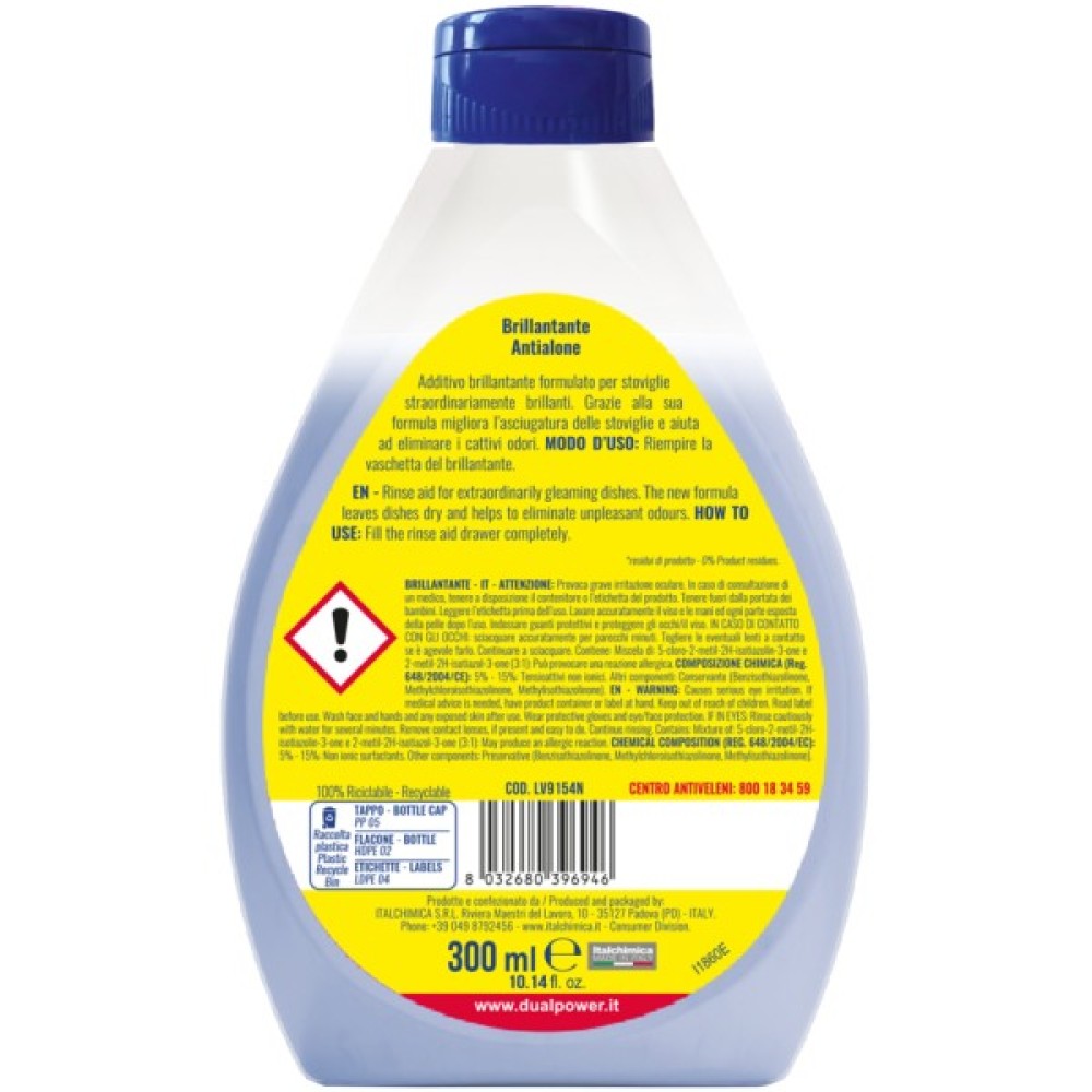 Ополіскувач для посуду в посудомийних машинах Dual Power надає посуду бездоганного блиску, пом'якшує воду, щоб вона стікала з посуду рівномірно, та видаляє неприємні запахи. У результаті, посуд висихає швидше, і вода не залишає плям і вапняного нальоту.