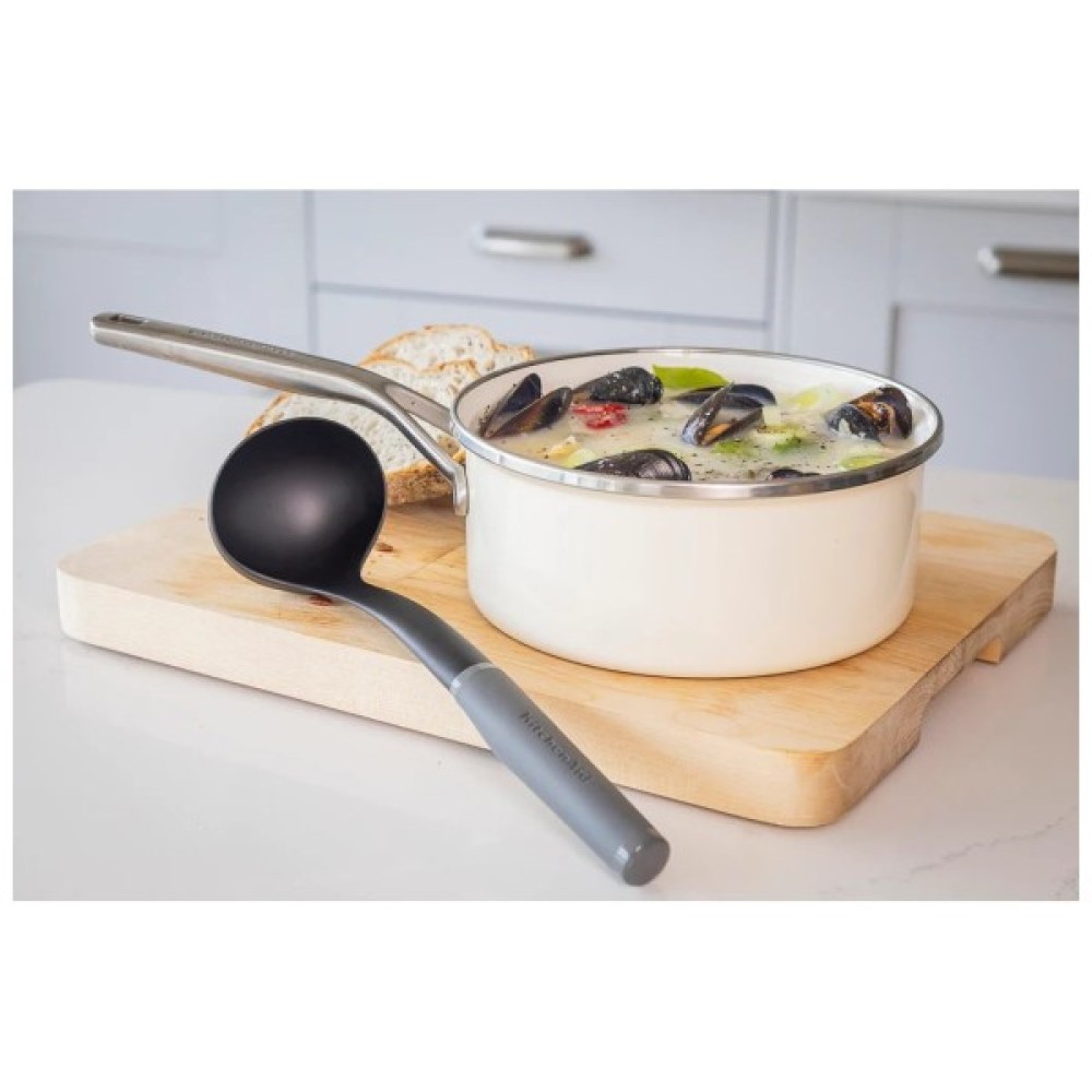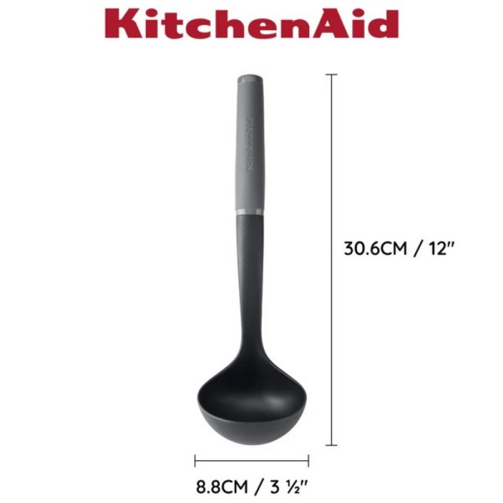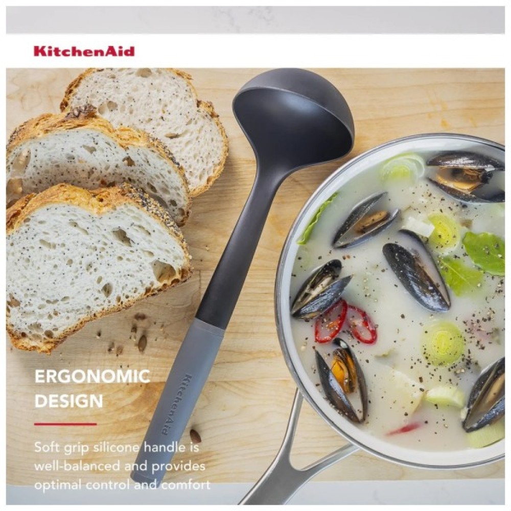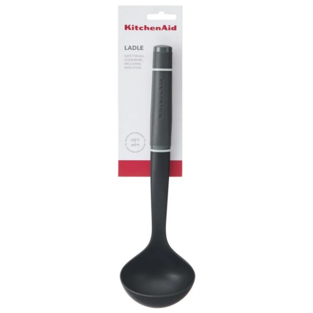 Ополоник KitchenAid ідеально підходить для розливання підлив, супів, рагу, заправок і соусів. Цей міцний, довговічний ополоник можна використовувати на будь-якому посуді, в тому числі з антипригарним покриттям, і він термостійкий до 232°C/450°F. М'яка ручка з рельєфним логотипом, яку можна мити в посудомийній машині для легкого очищення.