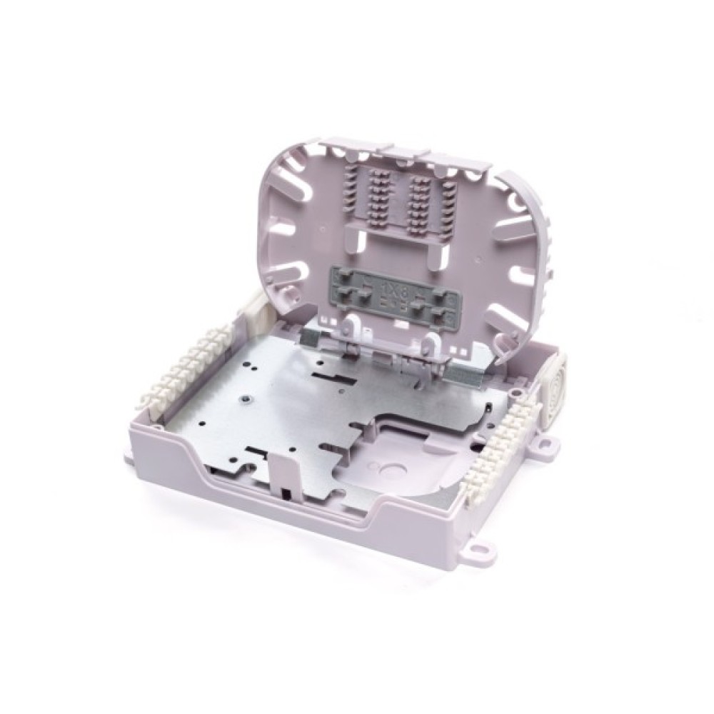 Всередині корпуса знаходиться вставка, на якій розміщується запас волокон пігтейлів, ложементи для КДЗС і оптичні адаптери для підключення вхідних роз'ємів сплітерних модулів. Зона монтажа ОВ закривається металевою кришкою, до якої можуть кріпитись сплітерні USM - модулі 1х4 або 1х8.