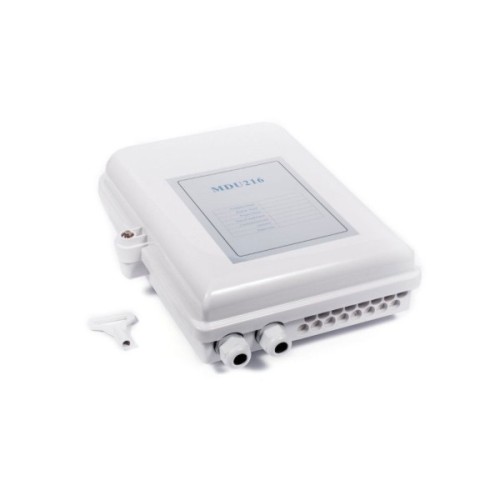 Опис оптичного боксу RCI MDU 216 Тип конструкції/кріплення: зовнішній / до стіни, до опори. Рівень захистів: IP67; герметизація стиків і отворів; УФ-стійкий матеріал виконання. Кріплення: до стіни - дюбеля (у комплекті), до опори - монтажна стрічка, скріпи або спеціальні хомути (опціонально). Кабельні вводи/виводи: 2/16 Кабельні вводи PG13.5 ( монтажний отвір Ø21мм, Що вводиться кабель Ø 6-12мм) - 2шт; Висновки для абонентських кабелів (патч-кордів) Ø10мм - 16шт. Максимальна кількість зварювань: 24 Двостороння відкидна сплайс-касета ном. ємністю 12 волокон (макс.- 24) для укладання гільз і запасу оптичних волокон. Є можливість установки механічних з'єднувачів волокон. Внутрішня консоль: планка під адаптери, кабельні фіксатори Планка на 16 (або металева на 18) отворів під адаптери. Металеві кабельні фіксатори - 2шт. Можливість встановлення дільника 1х16 з конекторами. Замок: різьбове з'єднання, засувки Кришка на клямці з додатковою фіксацією нарізним сполученням , для якого призначений пластиковий ключ (в комплекті).