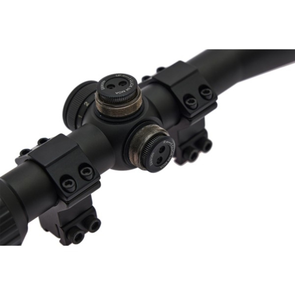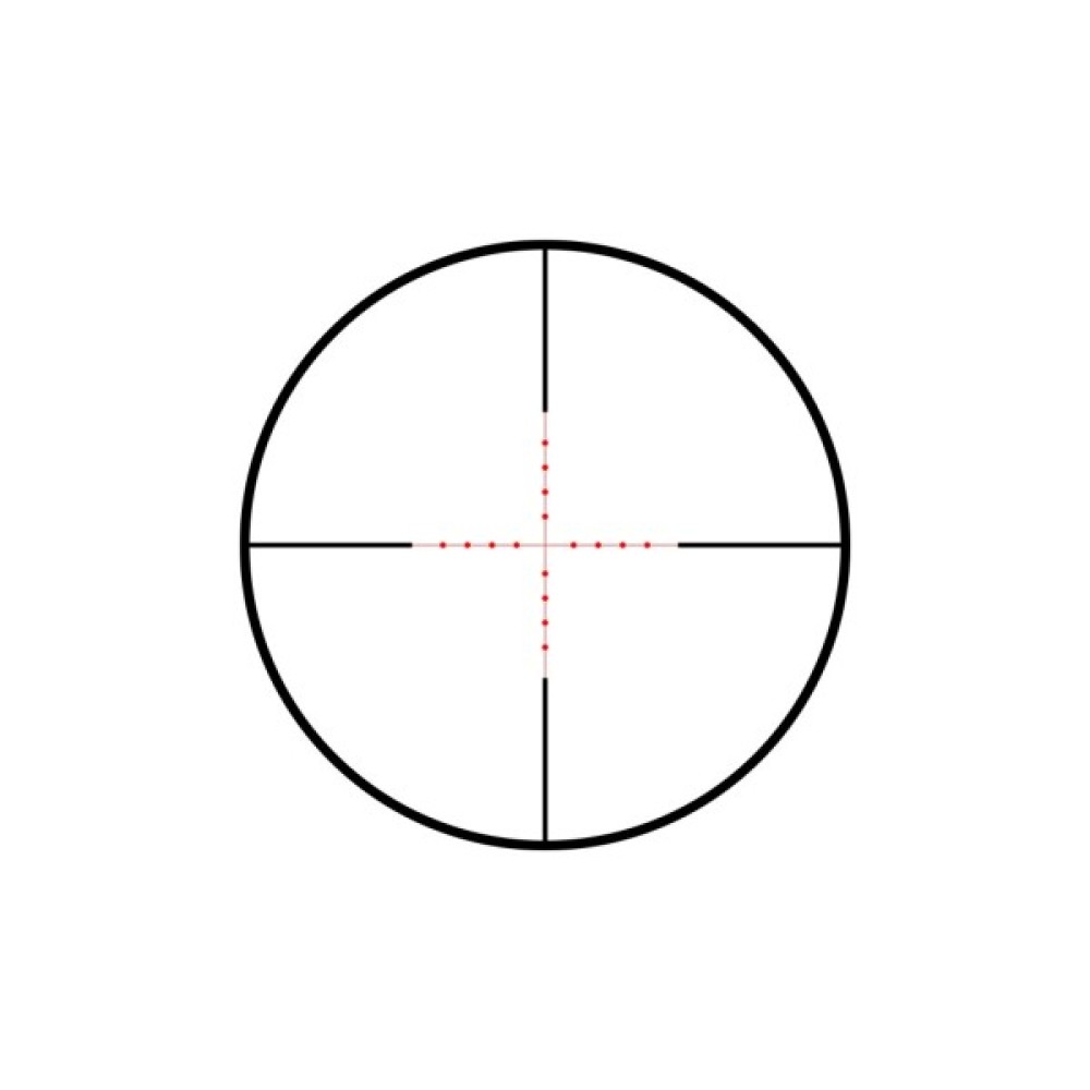 Прицільна сітка Mil-Dot виконана у вигляді перехрестя з додатковими точками та має підсвітку червоного або зеленого кольору. Mil-Dot – це універсальна та дуже популярна мітка, яка підійде для пострілів по рухомих цілях як на коротких відстанях, так і більш середніх дистанціях. Ефект пapaлaĸca регулюється від 9 метрів і до нескінченності.