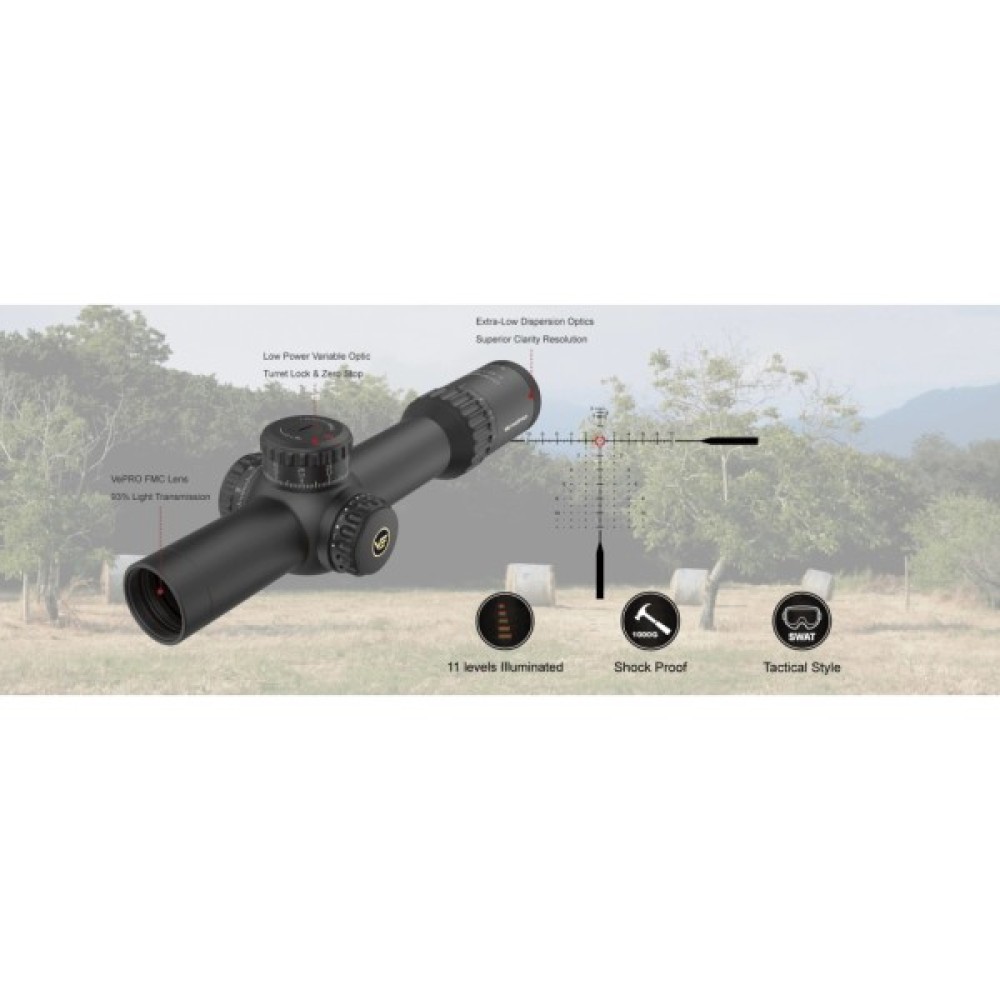 - Підсвічування прицільної сітки: Приціл оснащений функцією підсвічування прицільної сітки з 11 рівнями яскравості червоного кольору. Це дозволяє використовувати його в умовах низького освітлення або яскравому світлі.