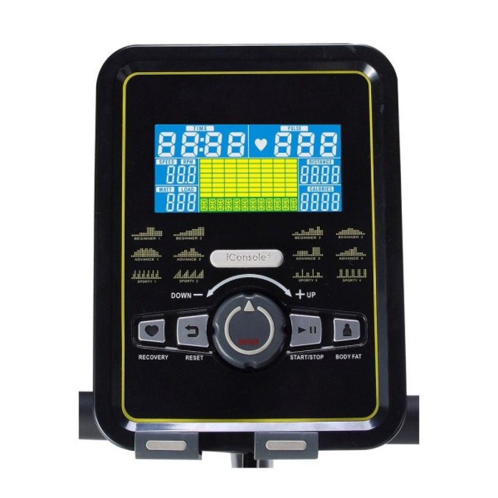 Дисплей: 12 автоматичними тренувальними програмами, режим користувацьких програм , режим H. R. C. контролю серцевого ритму, режим встановленої потужності, режим вимірювання тілесного жиру, режим відновлення Recovery, всього 20 програм;