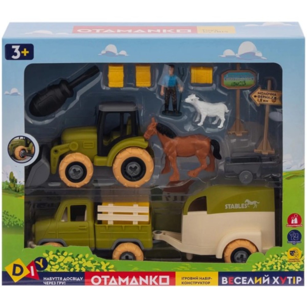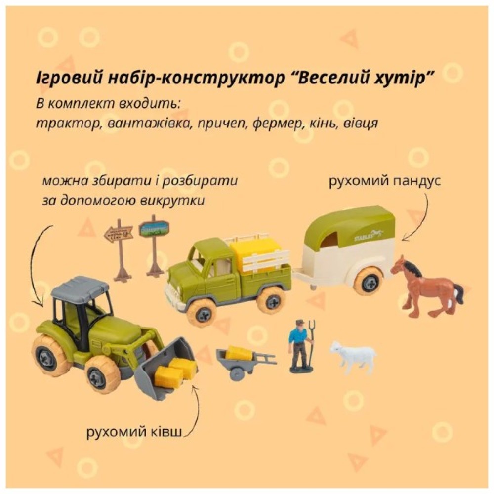 Ігрові набори-конструктори ВЕСЕЛИЙ ХУТІР – це тематичні іграшки, що створені для цікавих сюжетних ігор та ознайомлення дітей з життям на фермі, вивченням тварин та сільськогосподарської техніки.