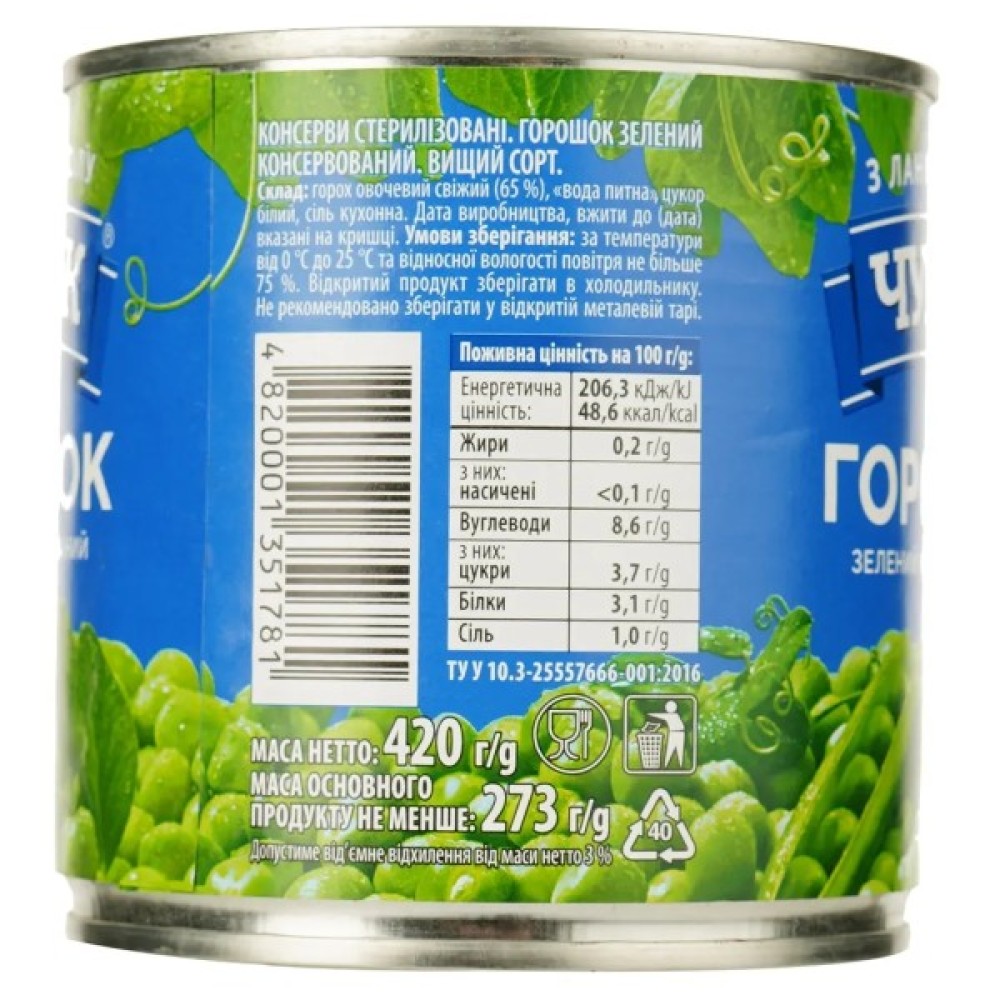 Овочева, консервація, Чумак, Горошок, зелений, 420, г, 4820267040689