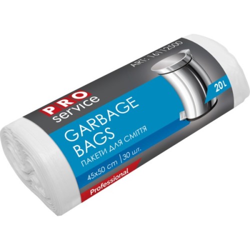Пакети PRO service об'ємом 20 л білого кольору використовуються з невеликими контейнерами або кошиками для сміття в готельних санвузлах, приміщеннях мед. установ і ін.