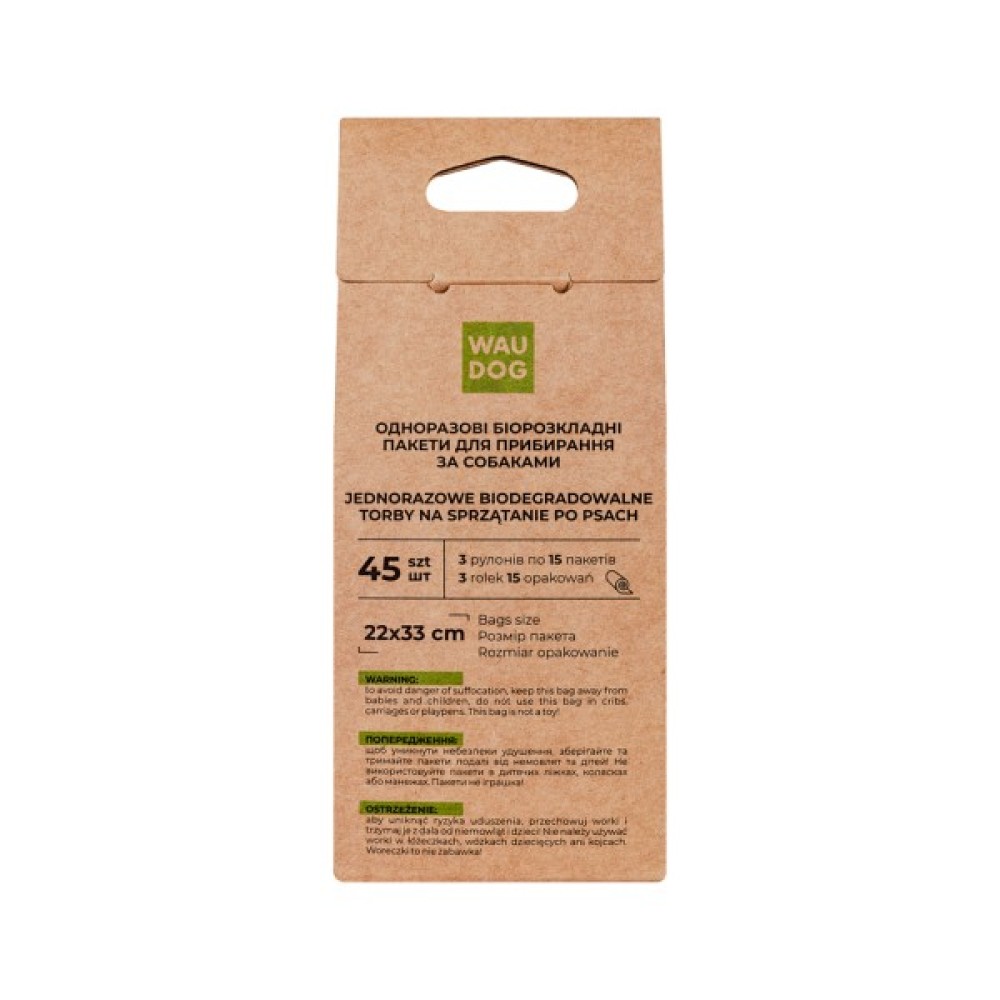 Переваги: • Міцні та водонепроникні — витримують 2,5 кг або 2 л • Вигідне фасування: в упаковці 3 міні рулони по 15 пакетів у кожному • Розмір пакета підходить для великих порід: 22х33 см • 100% біорозкладні