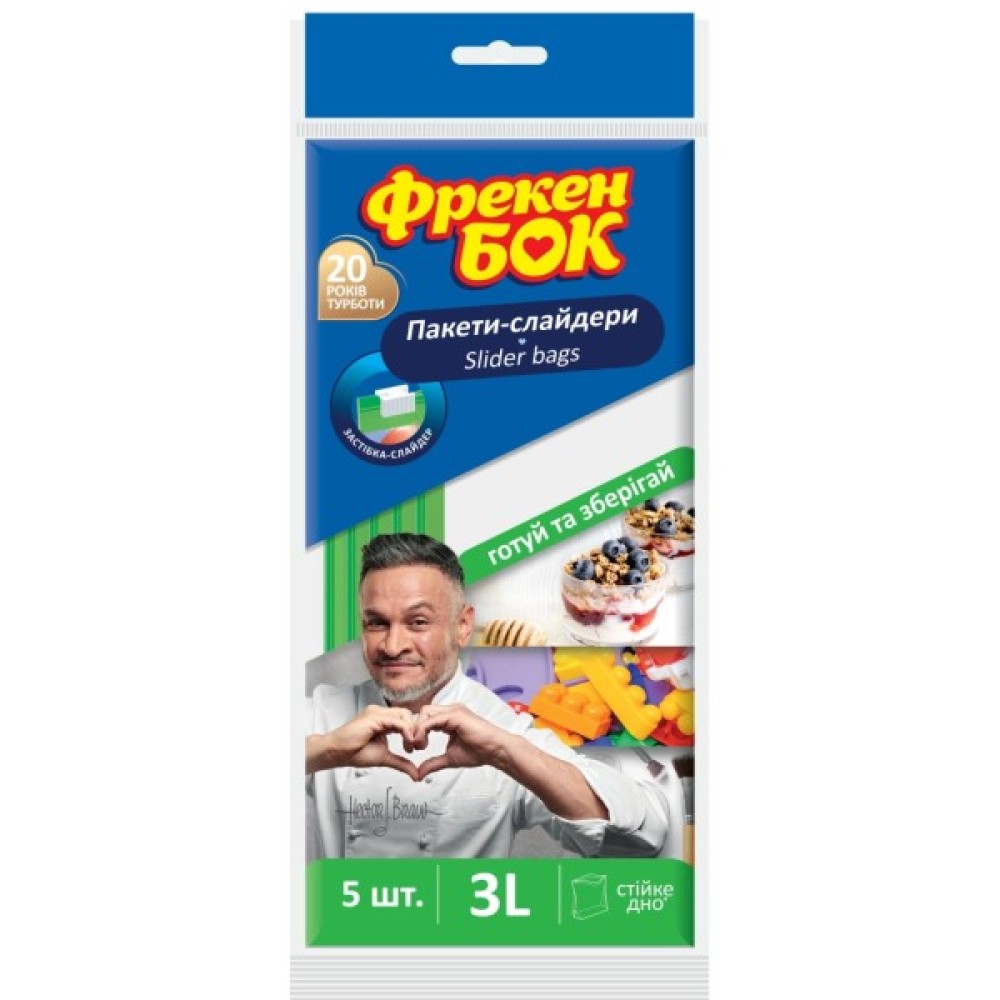 Універсальні пакети-слайдери торгової марки Фрекен БОК призначені для зберігання, заморожування й упакування харчових і нехарчових продуктів. Замок-слайдер надійно та герметично застібає пакет і запобігає витіканню рідин, а також спрощує процес відкривання.