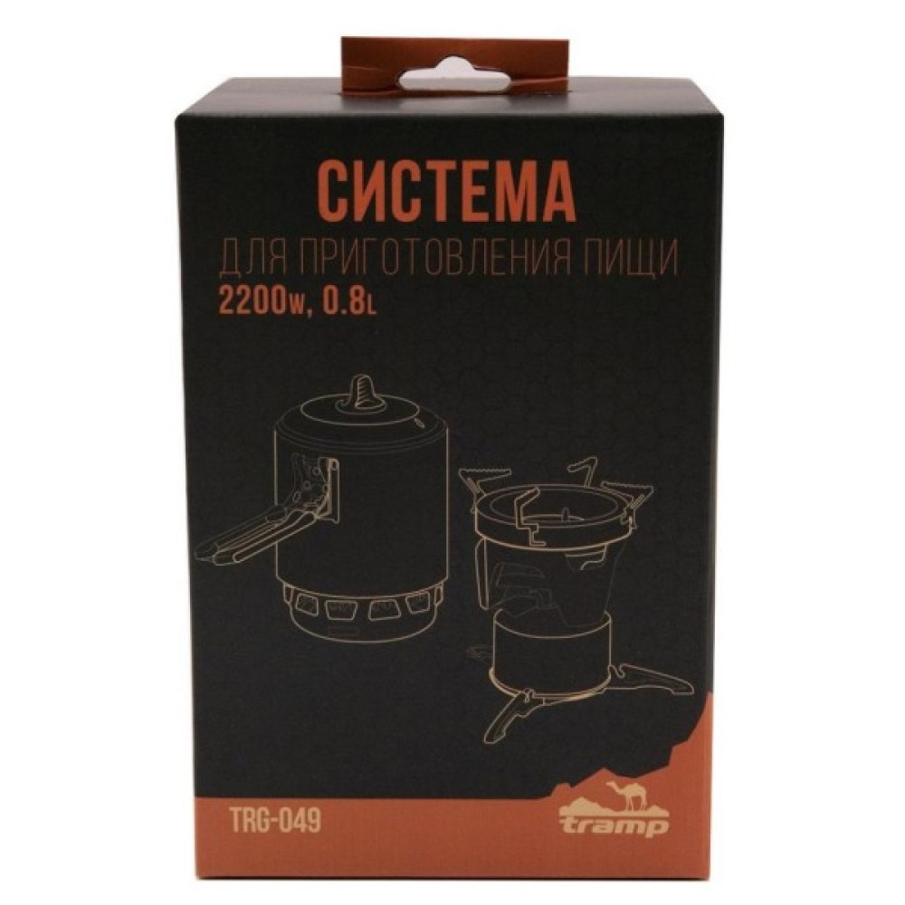 Інтегрована система приготування їжі Tramp TRG-049 складається з казанка на 800 мл в неопреновому чохлі з вбудованим в вітрозахисний екран радіатором - теплообмінником і газового пальника, що підключається до нього, а також підставки під газові балони і таганка для використання іншого посуду в режимі звичайного пальника.