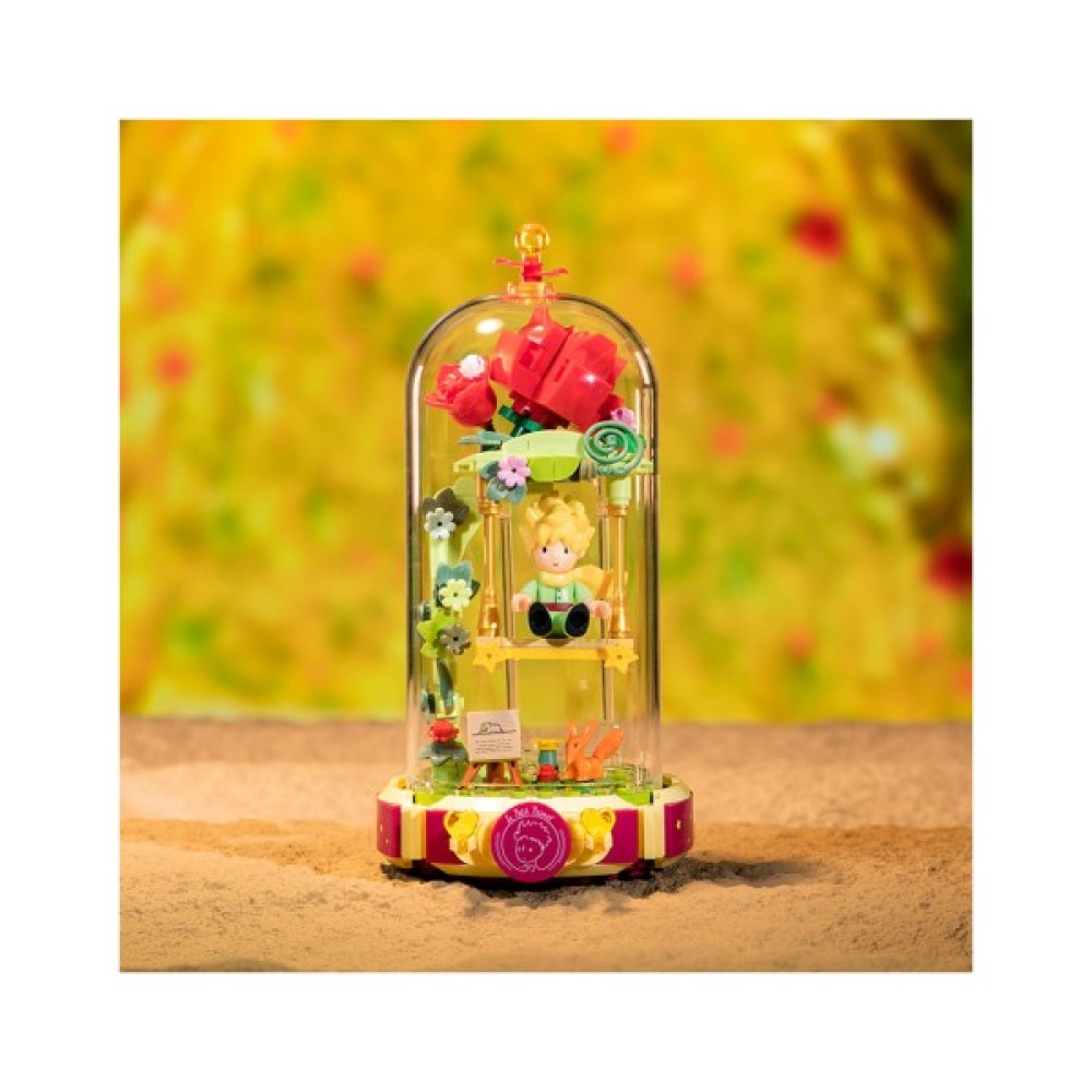 Дизайн конструктора втілює в життя сцену, де маленький принц насолоджується моментом на гойдалці між червоними трояндами, які ростуть під скляним куполом. Ця композиція є символом чистоти, любові та самотності — основних тем у творі. Модель виготовлена з високоякісного пластику, що гарантує довговічність і безопасність під час гри.