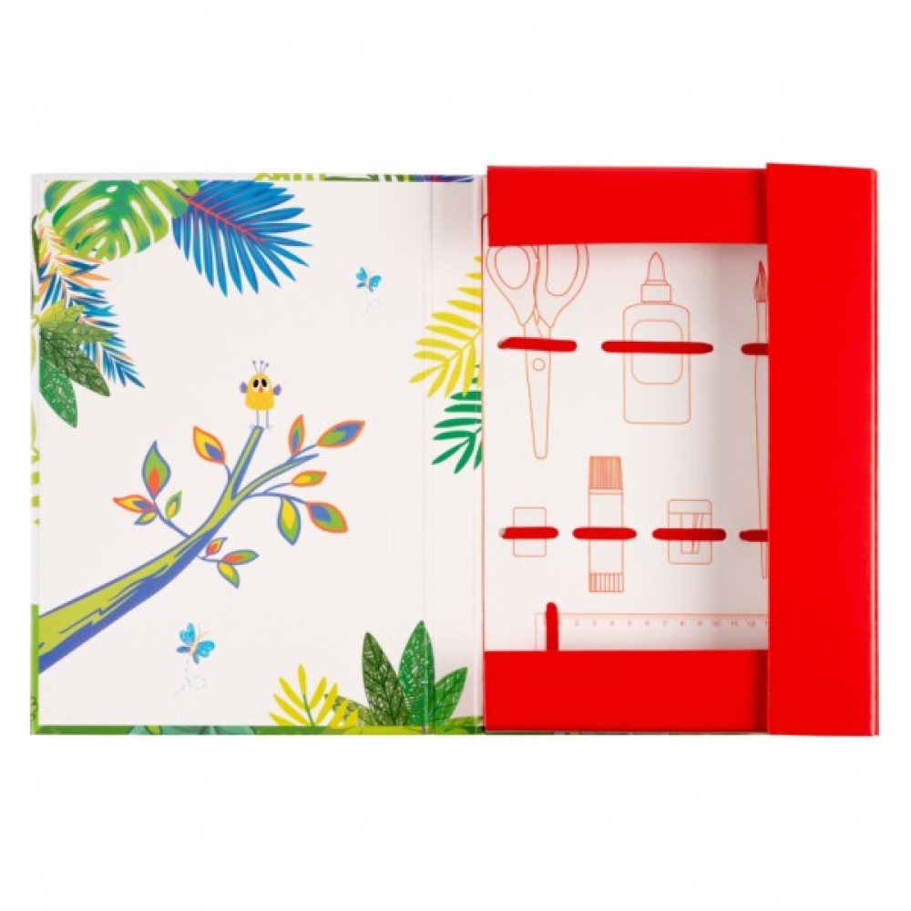 - На внутрішній поверхні папки нанесена схема розміщення приладдя для праці та гумки для їх фіксації;