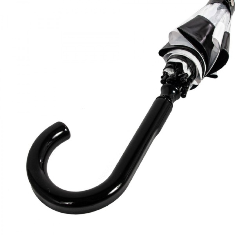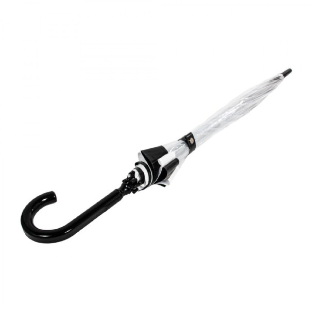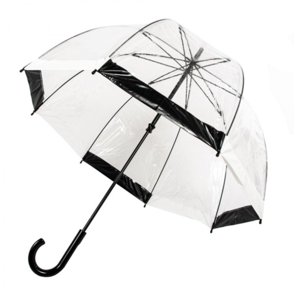 Прозорий купол з поліхлорвінілу з рожевими вставками діаметром 84 см має оригінальну конструкцію birdcage та забезпечує надійний захист від негоди, повністю приховуючи свою власницю від дощу та вітру. Парасолька відкривається та закривається вручну (механіка).