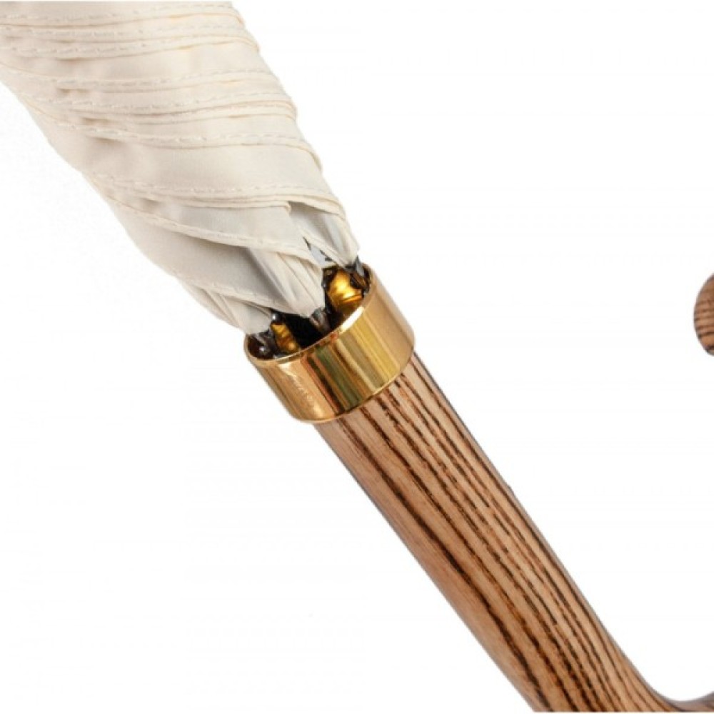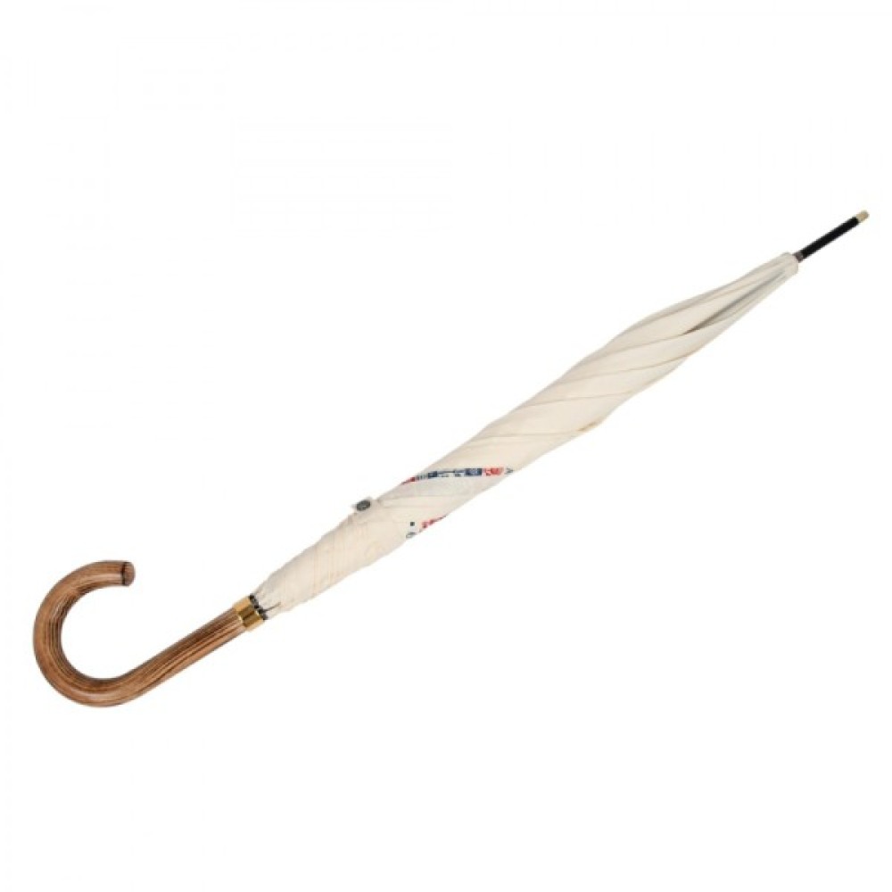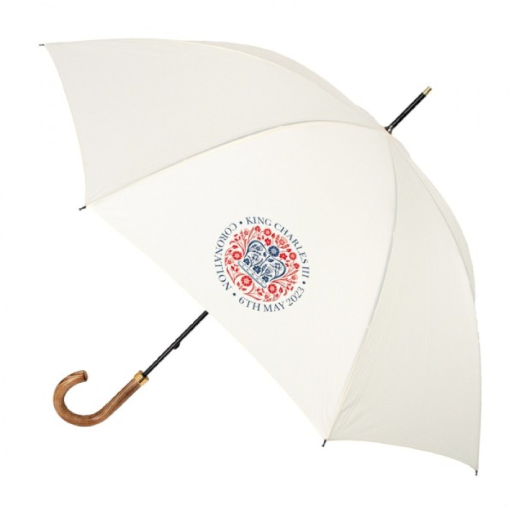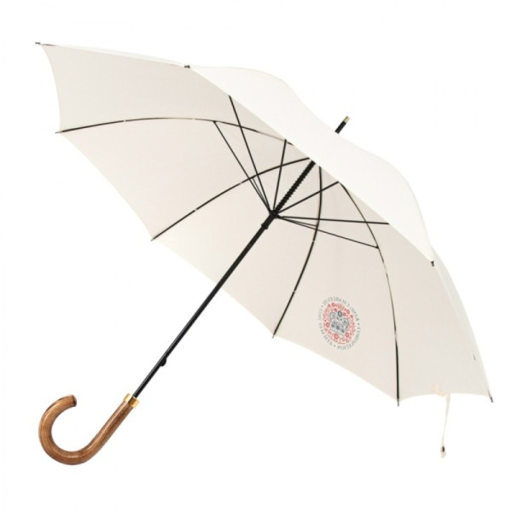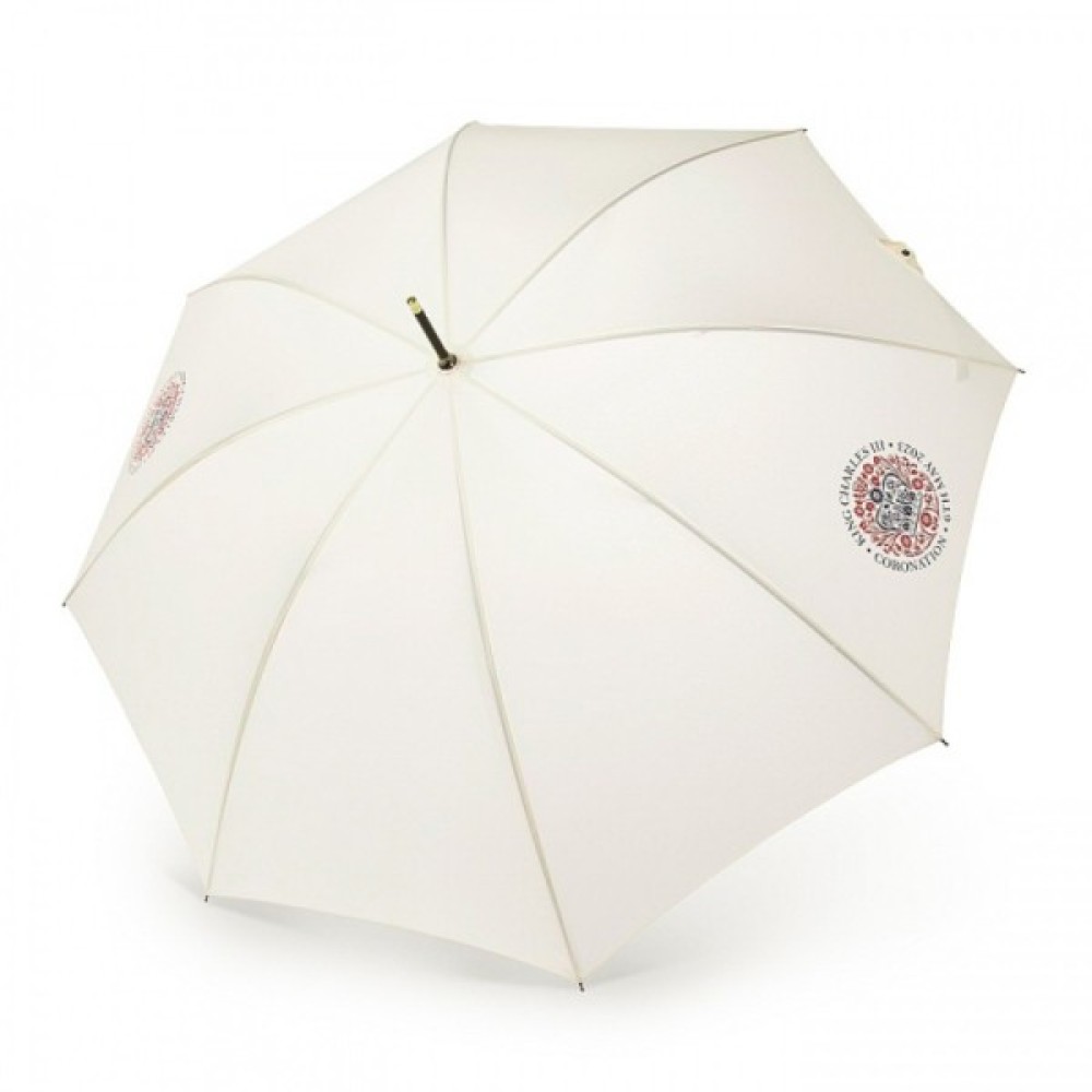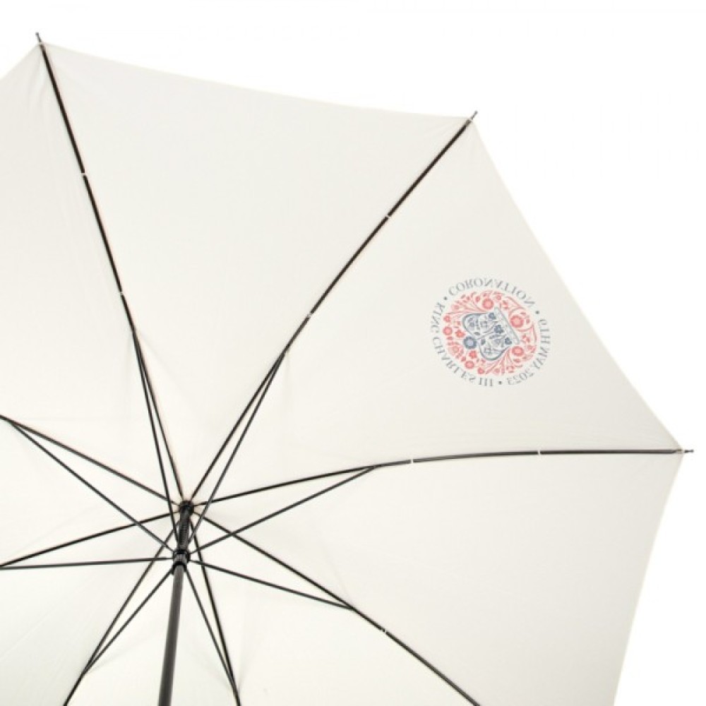 Лімітована парасоля- тростина Fulton G937 Commissioner Coronation в білому кольорі. Її створення компанія Fulton приурочила до Дня Коронаціії Чарльза III, про що свідчить герб монаршої сім’ї на куполі цього аксесуару.