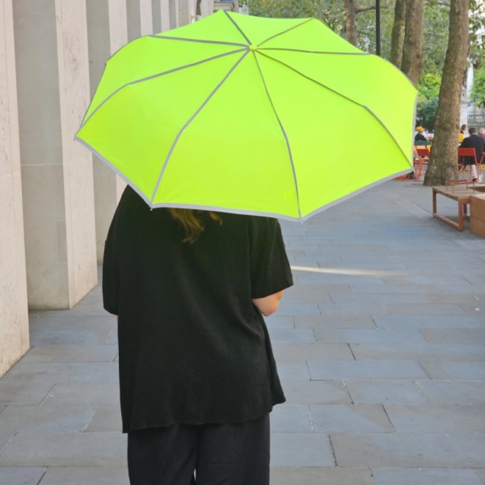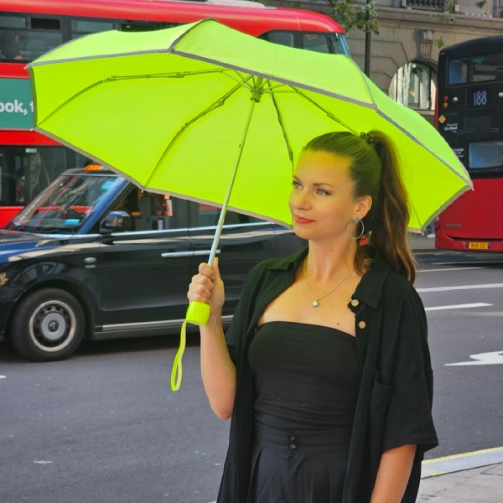 Незвичайна новинка від бренду Fulton Minilite -1 Neon L 353 лимонного кольору, має по краях і швах елементи, що відбивають світло, які відмінно видно в темний час доби. Також парасолька має захист UPF30+ від ультрафіолетових променів .