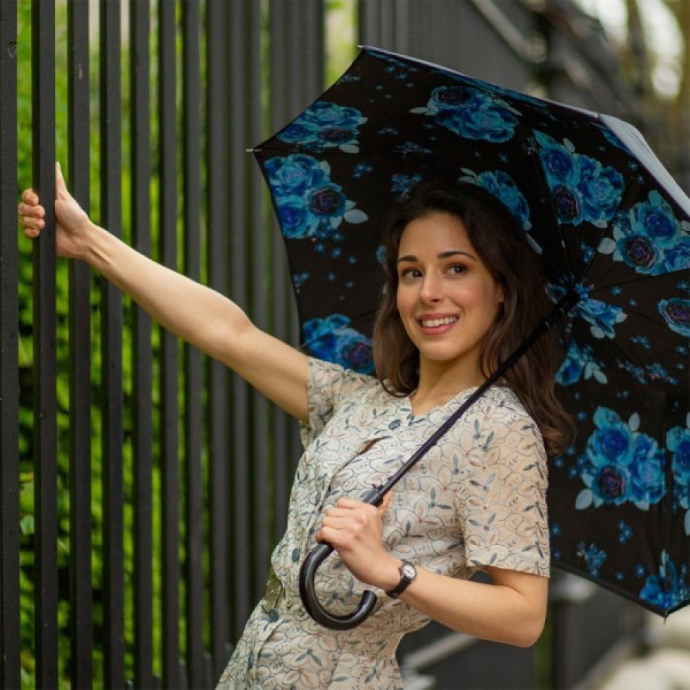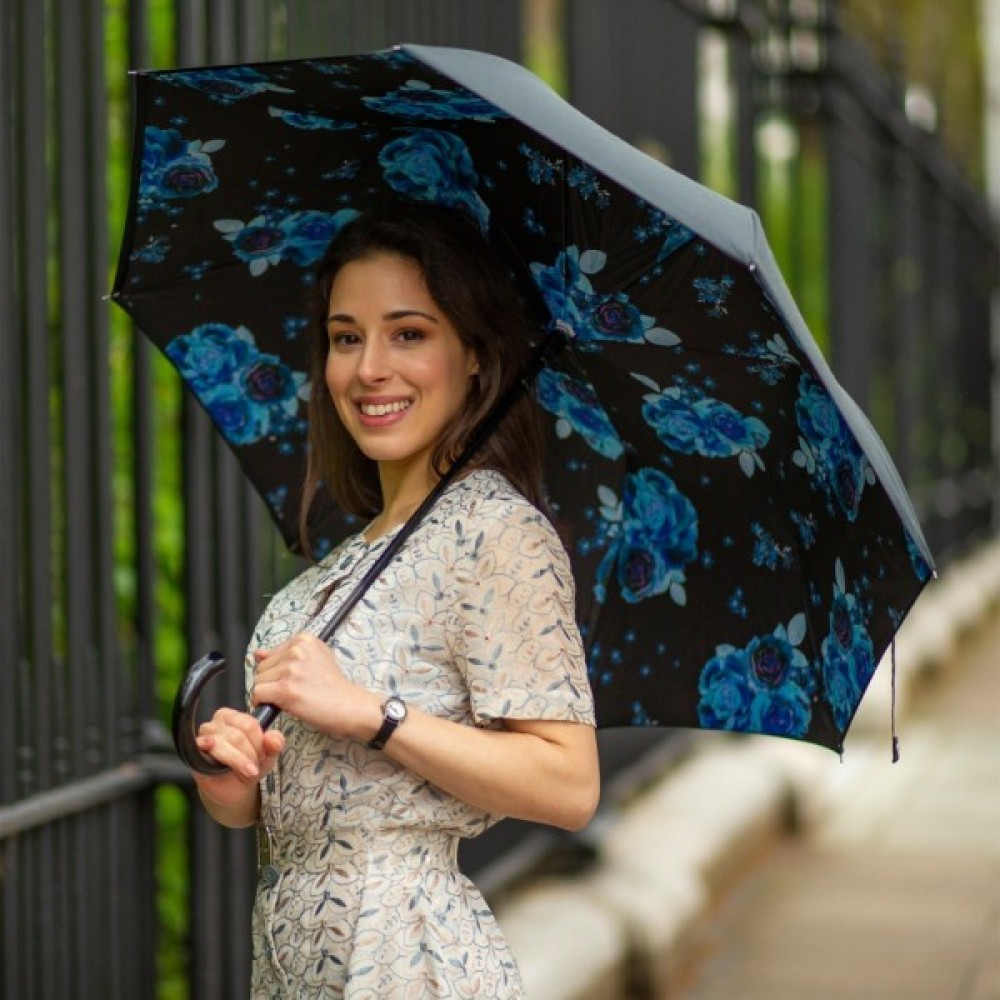 Зовнішня частина купола у чорному кольорі, а всередині – яскраві червоно-рожеві троянди. Такий подвійний купол ніколи не сплутає волосся у сильний вітер, оскільки спиці сховані між зовнішнім та внутрішнім куполом. Кнопка спускового механізму зручно розташована та стилізована під вінтажну.