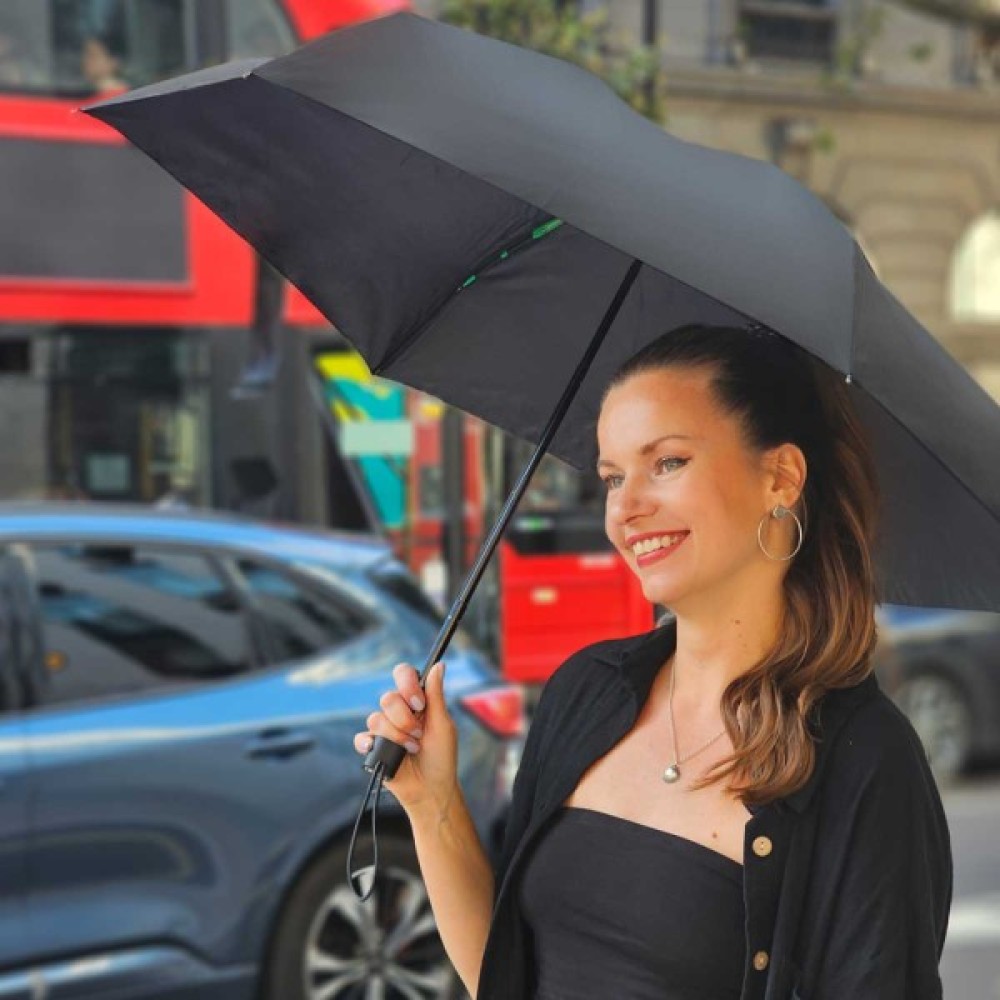 Незважаючи на мініатюрні розміри у складеному вигляді, парасолька оснащена куполом 95 см у діаметрі, що надійно захищає від негоди свого власника. Парасолька класичного чорного забарвлення буде вигідним доповненням і повсякденного, і ділового стилю.