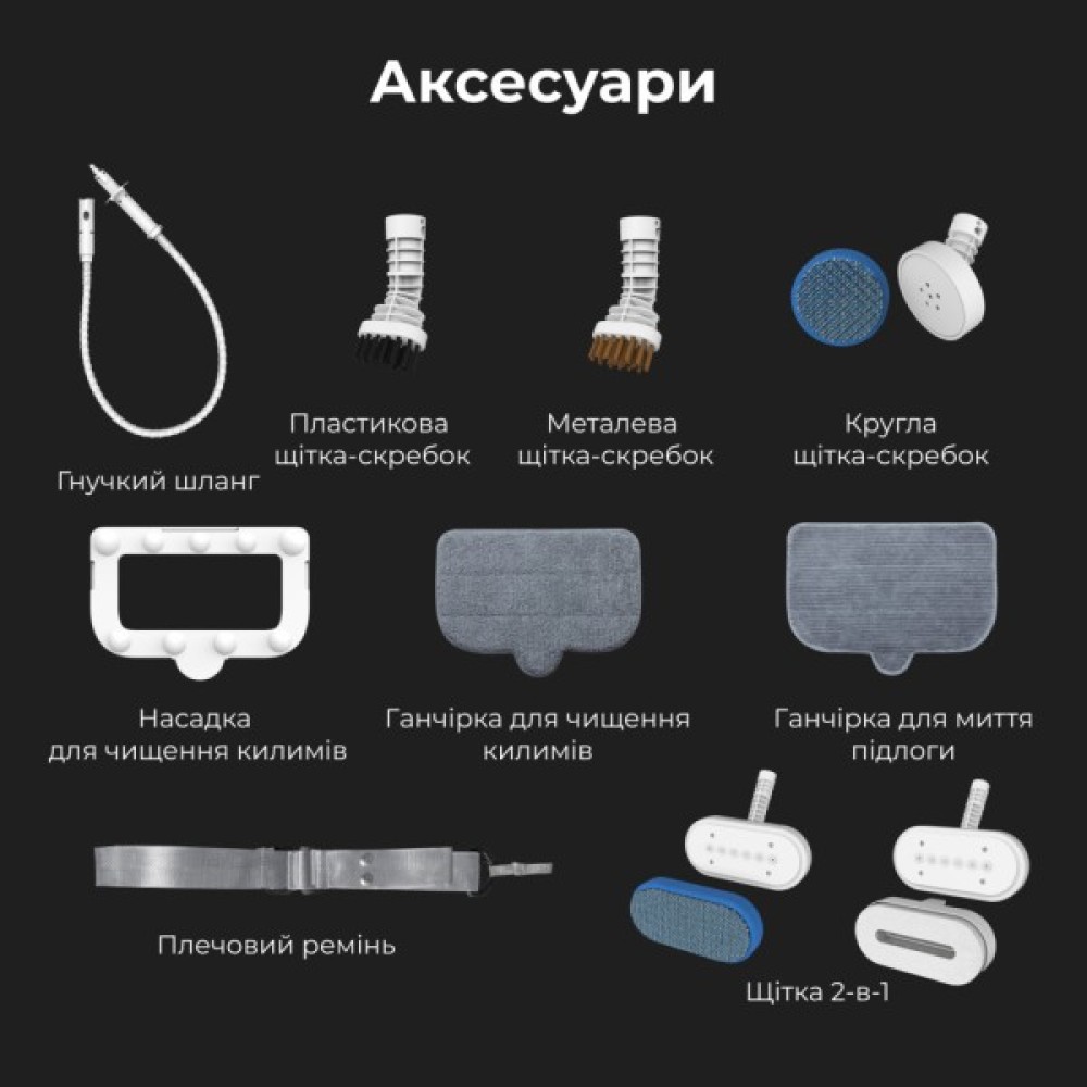 Завдяки різноманітним щіткам ви з легкістю очистите та знезаразите всю оселю! Підлоги і килими, стіни, двері, вікна, стільниці, штори і навіть взуття, одяг та іграшки – будь-які поверхні, що допускають температуру 110°C.
