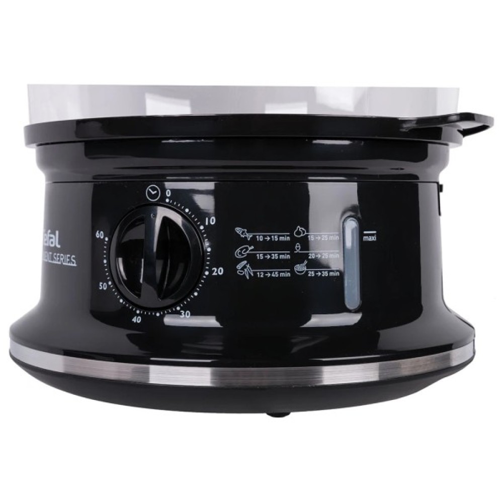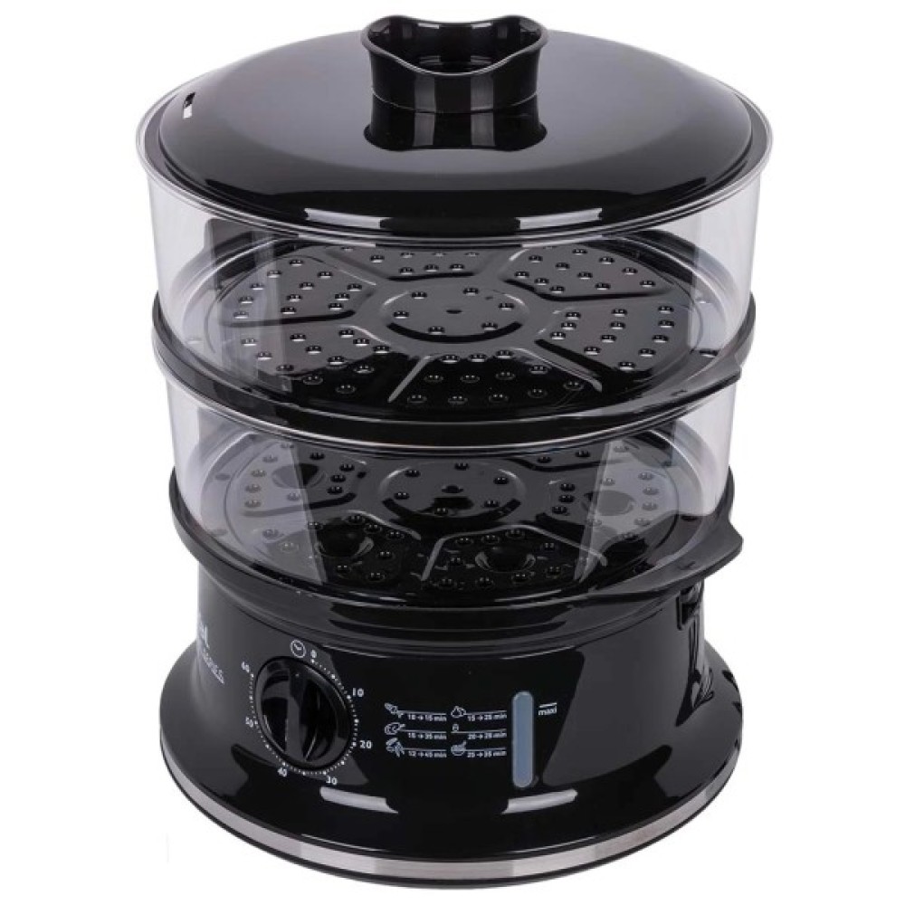 Пароварка має потужність 900 Вт. В ній ви зможете готувати найрізноманітніші страви. Два харчових лотка загальною ємністю 6 літрів забезпечують достатньо місця для приготування овочів, риби і м'яса. Також передбачена додаткова чаша для приготування рису. Чаші прозорі - ви зможете самостійно контролювати процес приготування. В цілях контролю також є таймер на 60 хвилин, який автоматично вимкне прилад по закінченню потрібного часу. Зручним є наявність зовнішнього індикатора рівня води - через невелике віконце ви завжди можете наочно бачити, скільки води в резервуарі, без знімання парових корзин. А якщо вода закінчується, то є можливість доливання прямо в процесі приготування.