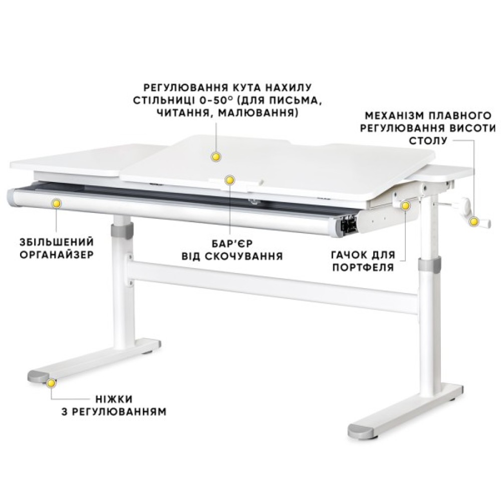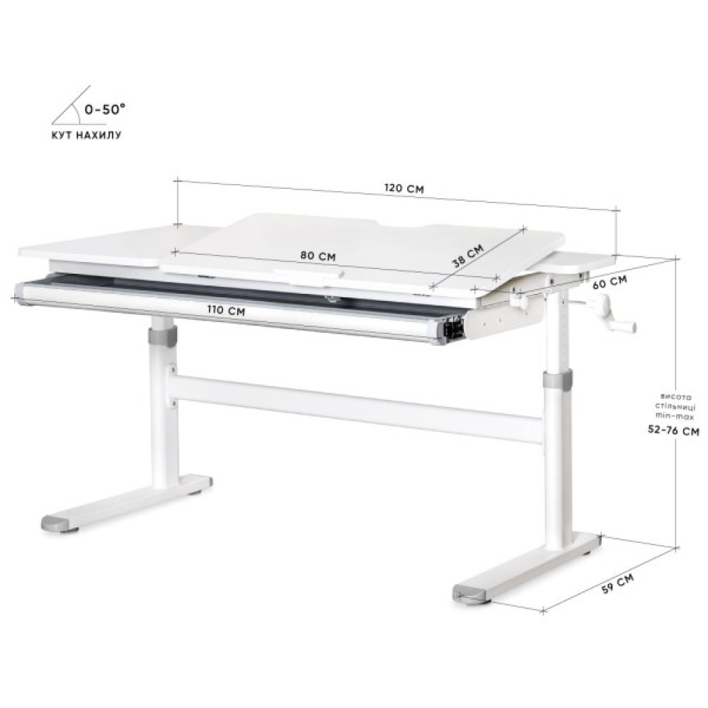 Регулювання висоти та нахилу стільниці: Evo-kids TH-360 Lite оснащений механізмом плавного регулювання висоти, що дозволяє адаптувати стіл під зріст дитини, забезпечуючи комфортне використання протягом багатьох років. Крім того, функція нахилу стільниці до 50 градусів дозволяє зручно організувати робочий простір для читання, письма або малювання.
