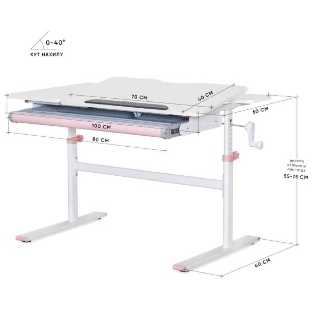 • Регульований нахил стільниці: Стільниця має кілька позицій нахилу, які підходять для читання, письма, малювання та інших занять. Це допомагає знизити навантаження на очі і підтримувати здоровий зір, адже дитина зможе працювати у комфортній позі.
