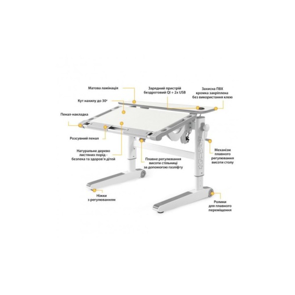 Також робоча поверхня стола обладнана функцією регулювання кута нахилу в діапазоні 0-30 градусів для підтримання правильної постави під час занять (читання, письмо, малювання).