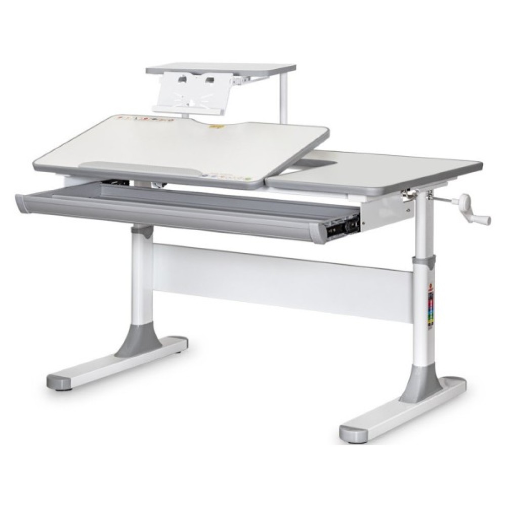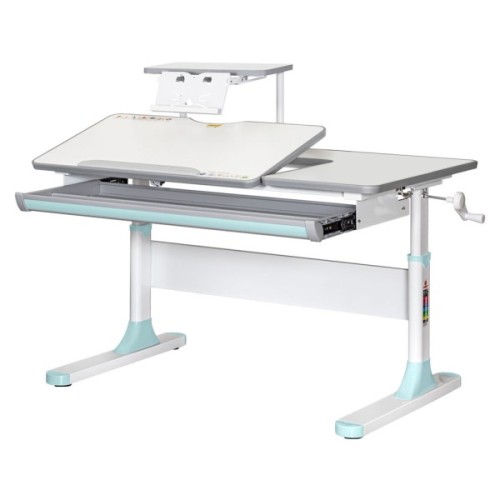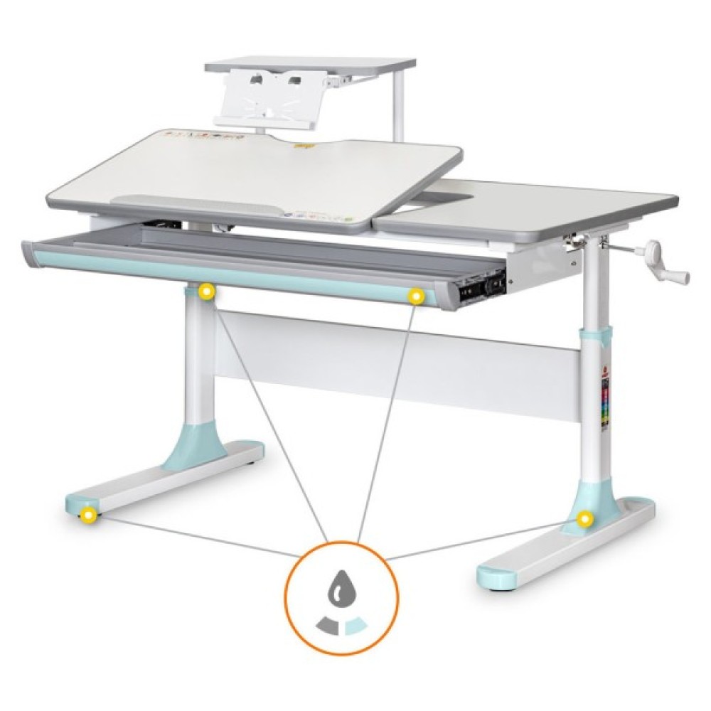 Висота столу регулюється за допомогою черв'ячного механізму ручкою, яку при складанні можна встановити праворуч або ліворуч. За допомогою газліфта рухлива частина стільниці змінює кут нахилу до 60 градусів, що допомагає зберегти правильну поставу під час роботи за столом.