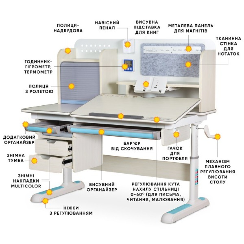 Під стільницею розміщуються два зручні та місткі органайзери. Зверху на парті кріпиться прогумований бар'єр-накладка, щоб запобігти скоченню приладдя під час виконання завдань.