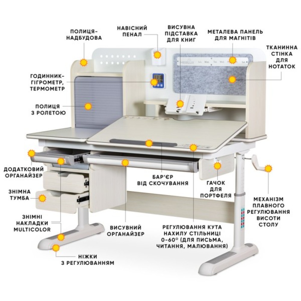 Під стільницею розміщуються два зручні та місткі органайзери. Зверху на парті кріпиться прогумований бар'єр-накладка, щоб запобігти скоченню приладдя під час виконання завдань.