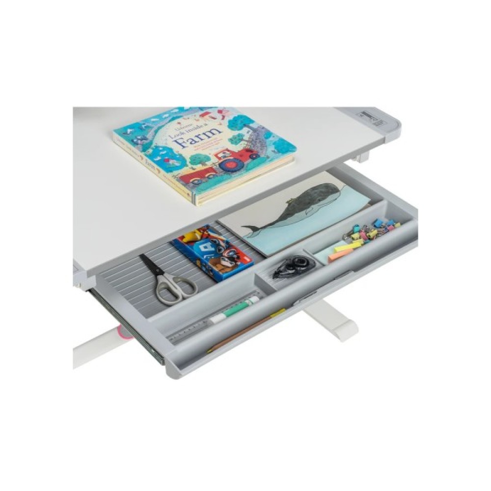 Парта має вбудований висувний ящик для канцелярського приладдя, що дає змогу організувати робочий простір і зберігати всі необхідні матеріали під рукою.