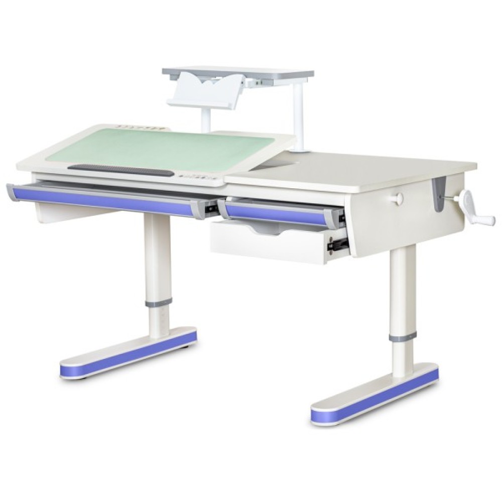 Під стільницею розміщується місткий органайзер, пенал для канцтоварів та дерев'яний висувний ящик для зберігання зошитів. Така різноманітність функціональних елементів столу допоможе організувати робочий простір вашої дитини. Висота столу легко регулюється за допомогою черв'ячного механізму ручкою, що розташовується з будь-якого боку. Стіл «зростає» разом із вашою дитиною і прослужить не один рік.