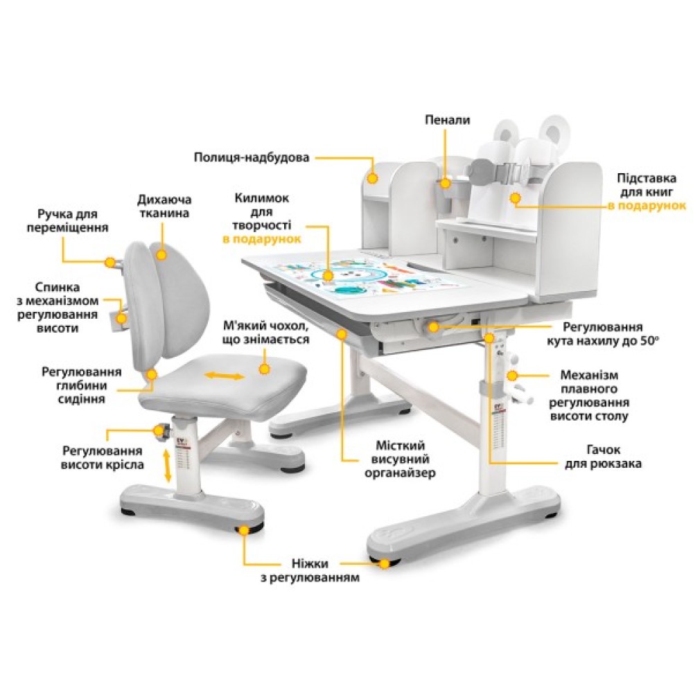 Стільниця змінює кут нахилу до 50 градусів та фіксується гвинтами. Стільницю можна використовувати не тільки для письма та читання, а й як мольберт. Під стільницею розміщений місткий висувний органайзер для зберігання дитячих речей. Приємним бонусом стане наявність знімного металевого гачка для розміщення портфеля чи спортивної форми.