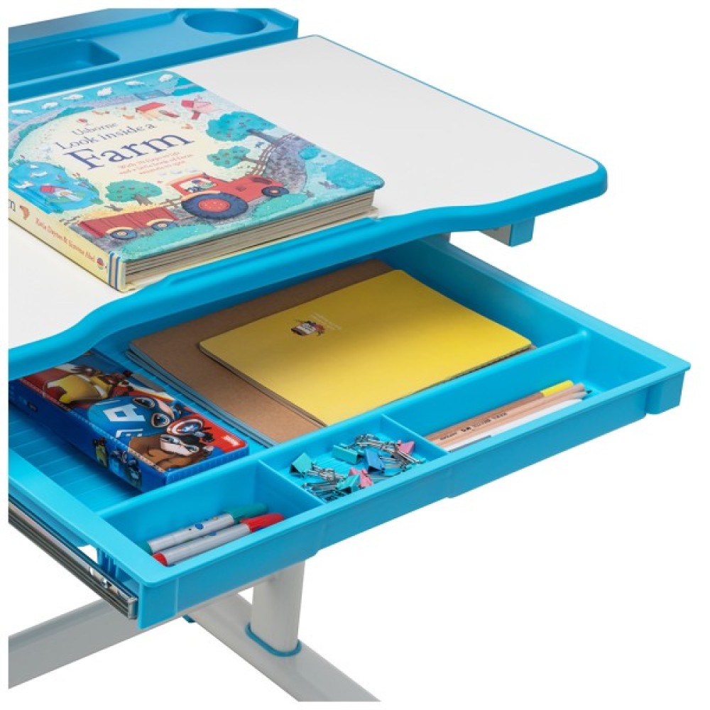 — механізм регулювання висоти дає змогу легко та швидко скоригувати стіл і стілець, що оптимально адаптує його під відповідний зріст дитини. Поверхня навчального стола має антивідблискове покриття й функцію нахилу до 40° для зручного писання, читання й малювання;