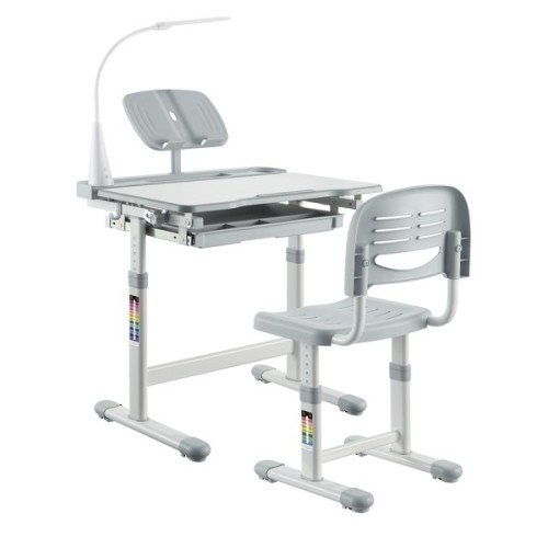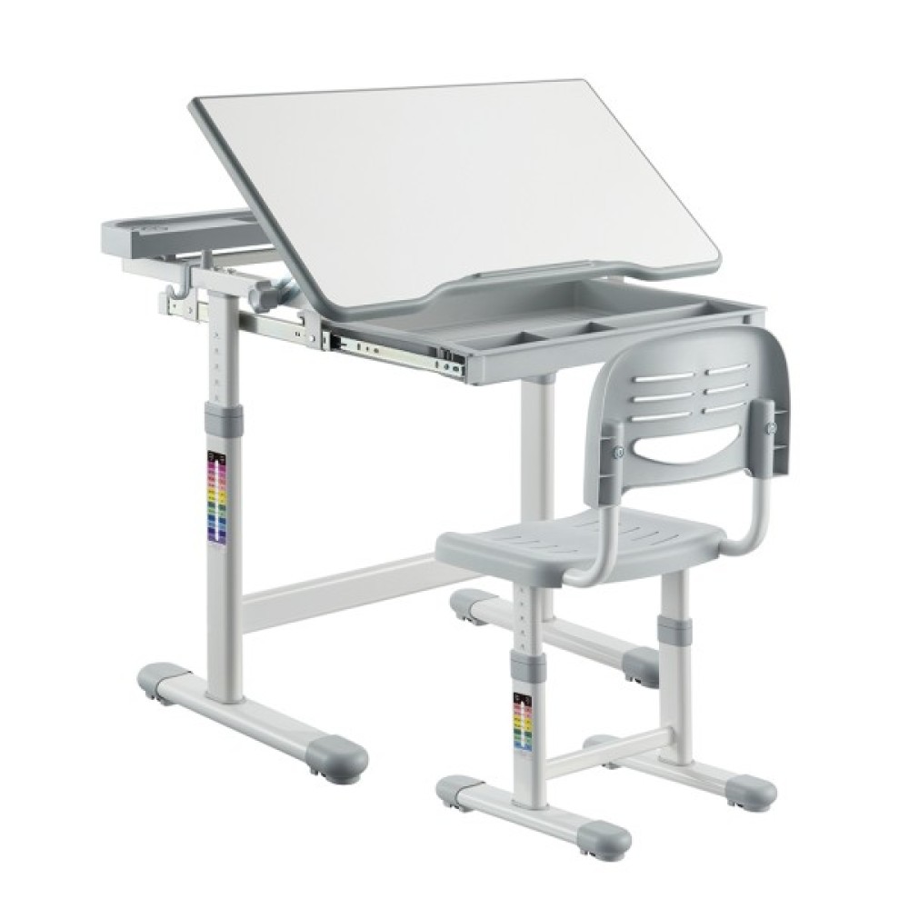 - Механізм регулювання висоти дає змогу легко та швидко скоригувати стіл і стілець, що оптимально адаптує його під відповідний зріст дитини. Поверхня навчального стола має антивідблискове покриття й функцію нахилу до 40° для зручного писання, читання й малювання;