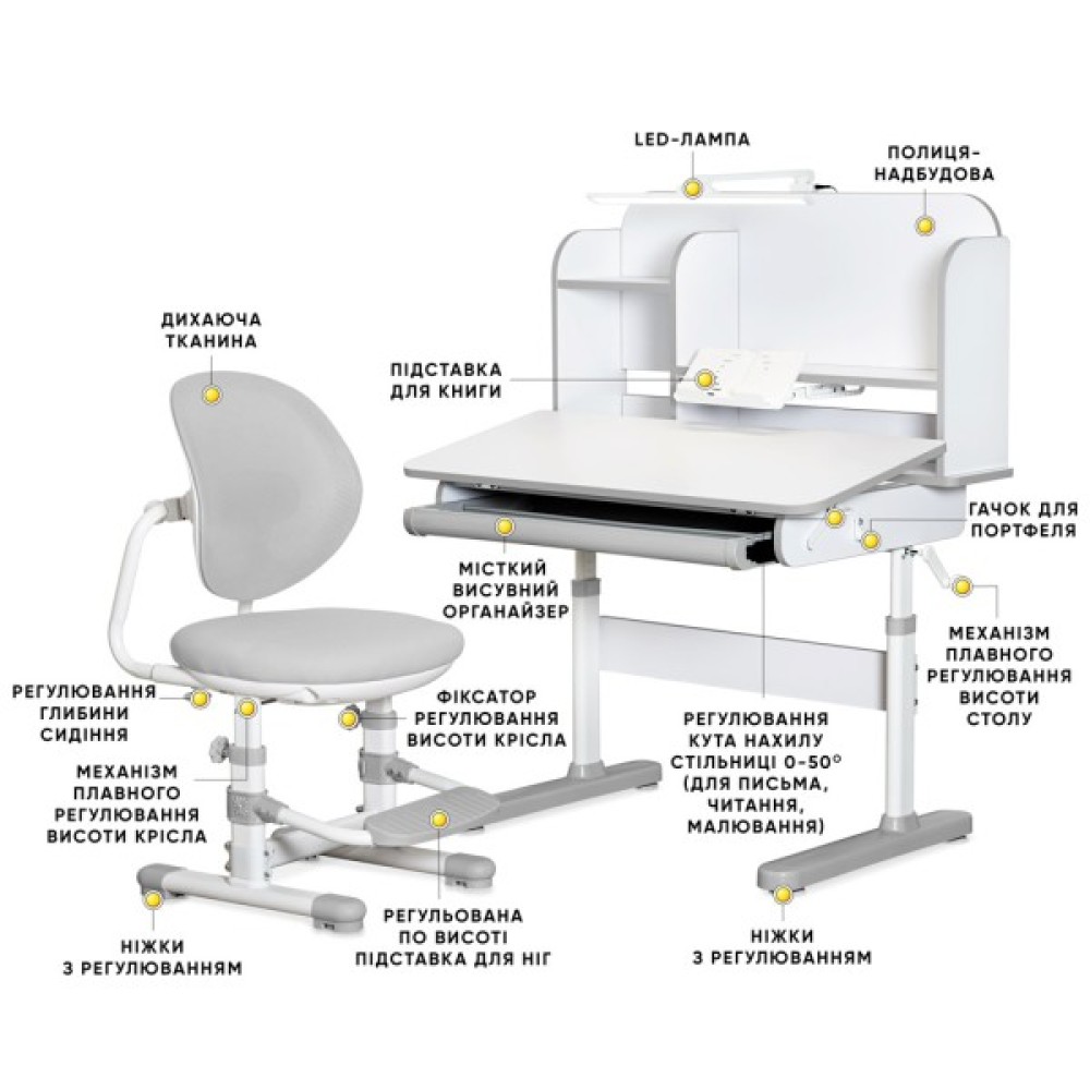 - Максимальна регуляція: Висота столу, кут нахилу стільниці, висота і глибина сидіння крісла, висота підставки для ніг – все це можна легко налаштувати під індивідуальні потреби дитини, забезпечуючи правильну поставу і знижуючи навантаження на спину