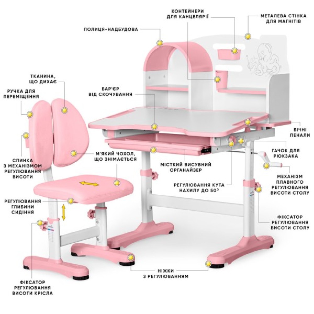 Mealux Octo – це сучасний, ергономічний комплект меблів, який ідеально підходить для дітей молодшого шкільного віку.