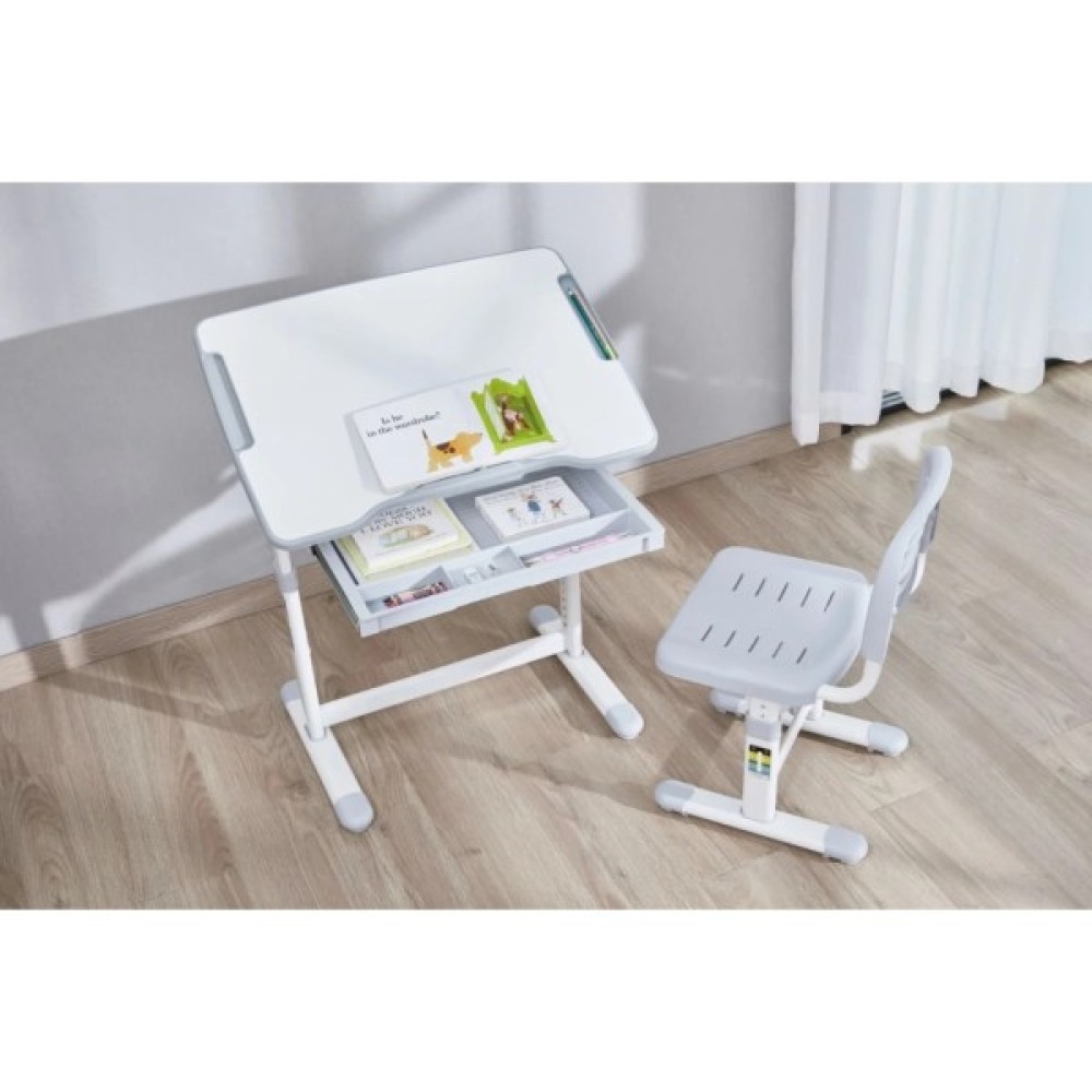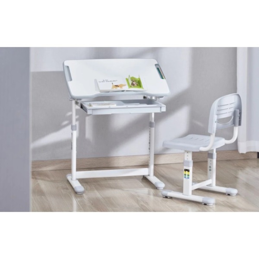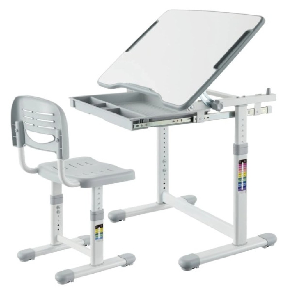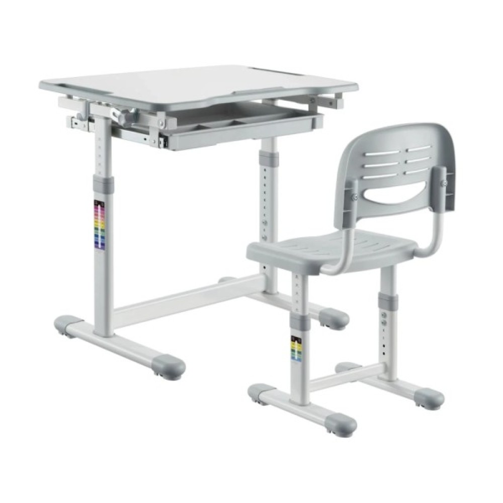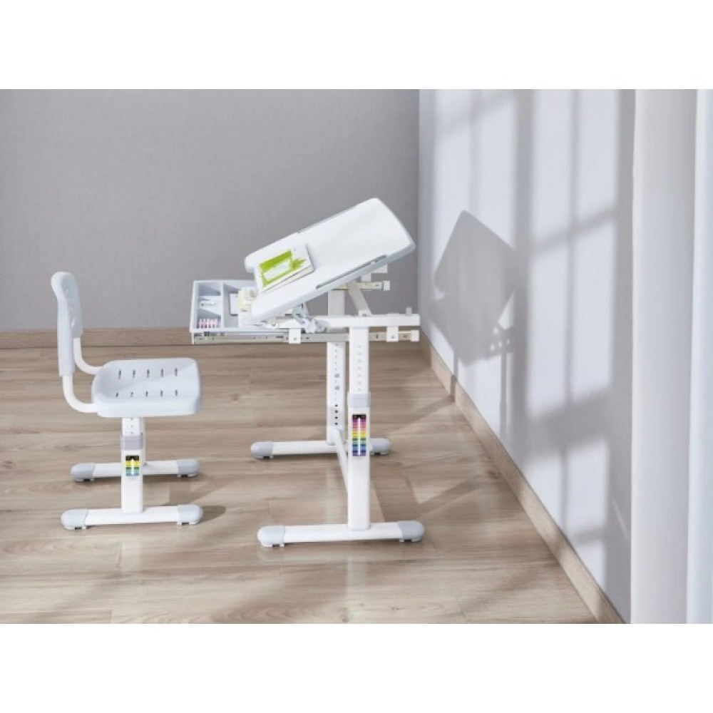 - Комплектація: регульована парта та стілець, гачок для портфеля, висувний ящик, монтажний комплект, інструкція з експлуатації.