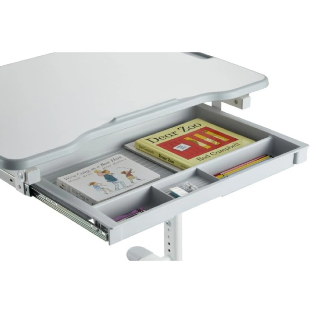 - Функціональні елементи: висувний ящик для зберігання канцелярії, гачок для портфеля та можливість регулювання елементів без необхідності повного розбирання.