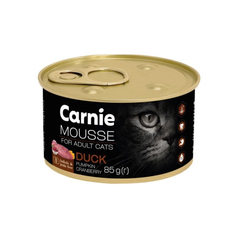 М’ясний мус з качкою, гарбузом, журавлиною та желе CarnieTM – це повнораціонний беззерновий холістичний корм для дорослих котів. Ніжний м’ясний мус із прозорим шаром ароматного желе дарує улюбленцю справжню гастрономічну насолоду, а відсутність зернових у складі продукту знижує ризик алергічних реакцій та проблем із травленням.
