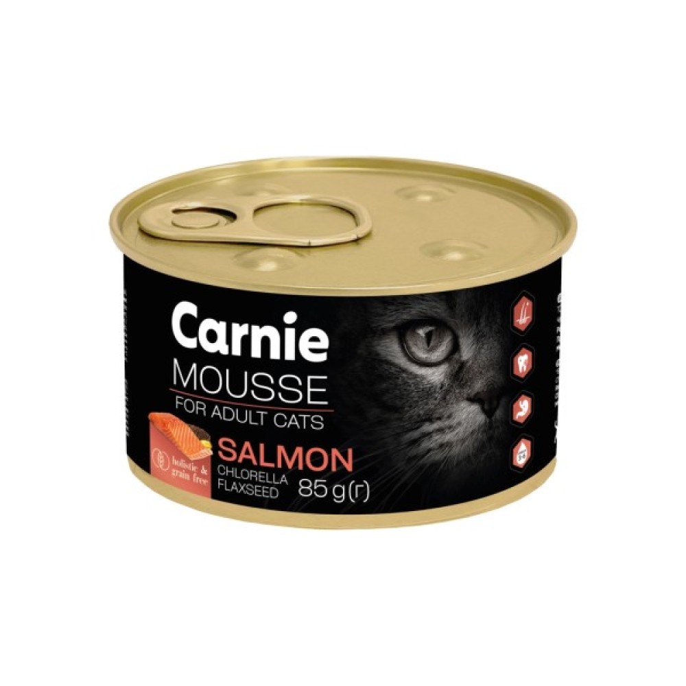 М’ясний мус з лососем, насінням льону, хлорелою та желе CarnieTM – це повнораціонний беззерновий холістичний корм для дорослих котів. Ніжний м’ясний мус із прозорим шаром ароматного желе дарує улюбленцю справжню гастрономічну насолоду, а відсутність зернових у складі продукту знижує ризик алергічних реакцій та проблем із травленням.