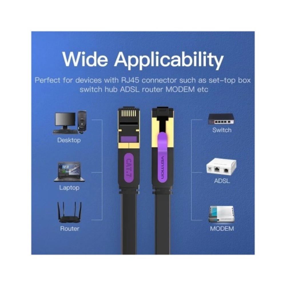 Мережевий кабель Vention Ethernet Flat Cable RJ45 CAT7 призначений для комутації комп'ютерних Ethernet-мереж зі стандартами 10BASE-T (10 Мбіт/сек), 100BASE-T (x) (100 Мбіт/сек), 1000BASE-T (x) (1 Гбіт/сек), 10GBASE-T (10 Гбіт/сек).