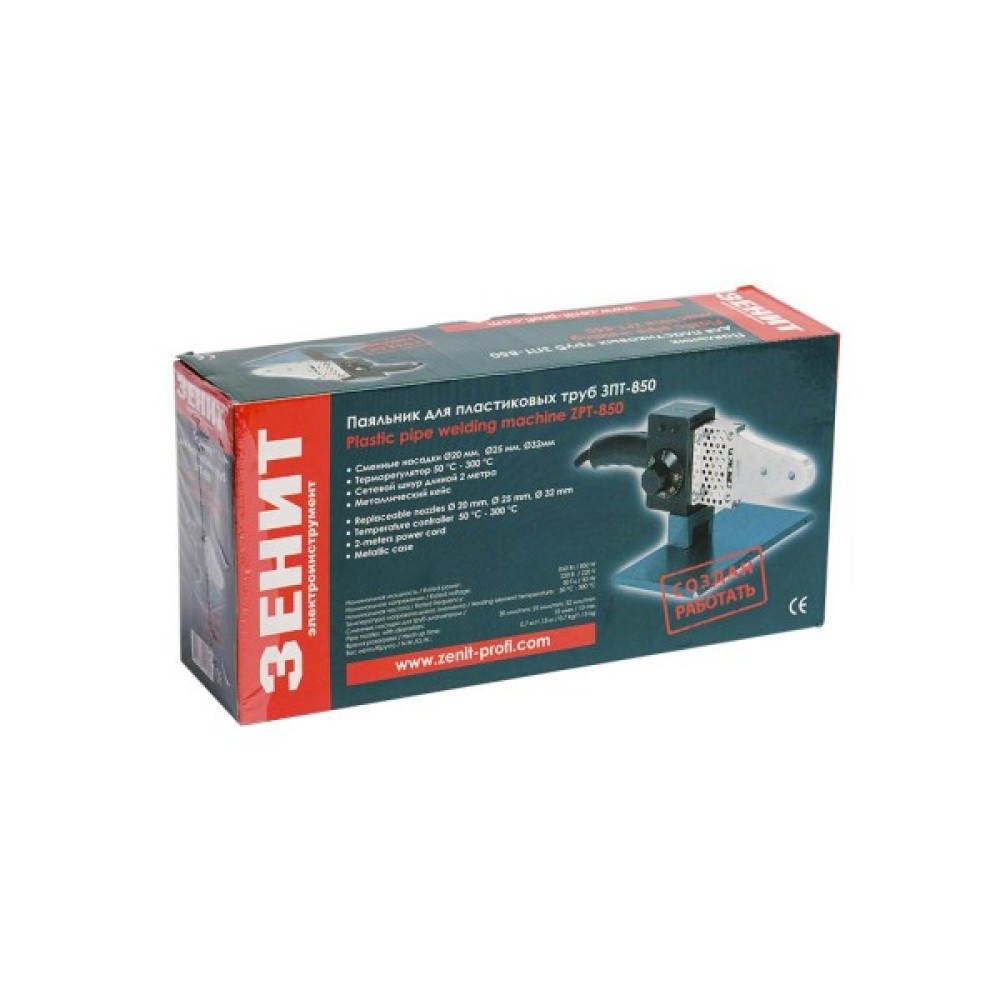 Основні технічні параметриПаяльник для пластикових труб ЗЕНИТ ЗПТ-850 працює від побутової електромережі змінного струму, його нагрівальний елемент розрахований на напругу 220 ± 10% В, 50 Гц.