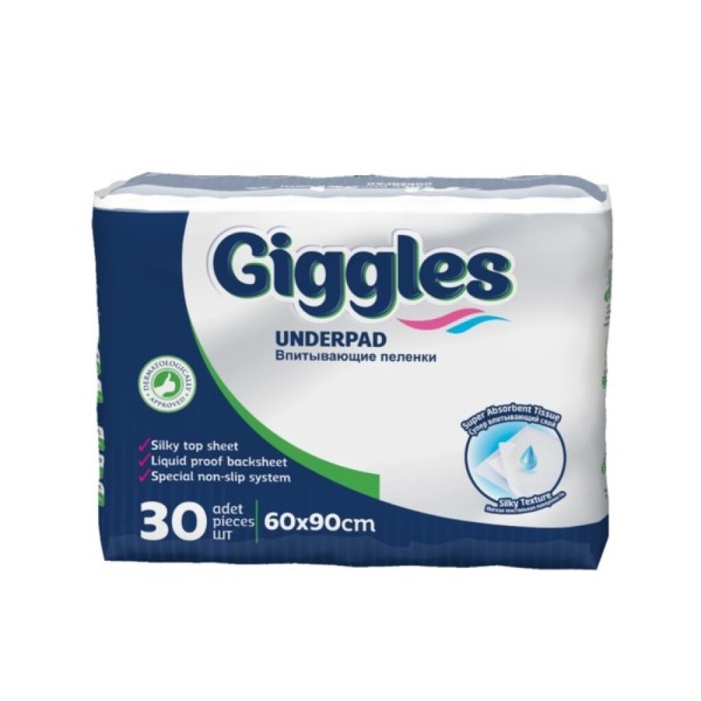 Одноразові пелюшки Giggles 60*90 см дуже зручні у використанні при зміні підгузника, проведенні гігієнічних процедур. Гарантують комфорт і додатковий захист постільної білизни, колясок, меблів та інших поверхонь. Основою пелюшок є розпушена целюлоза. Верхній шар складається з дуже комфортного, приємного на дотик нетканого матеріалу. Нижній шар - з водонепроникної плівки, яка захищає від протікання. Текстура шару не дозволяє пелюшці переміщатися і ковзати.