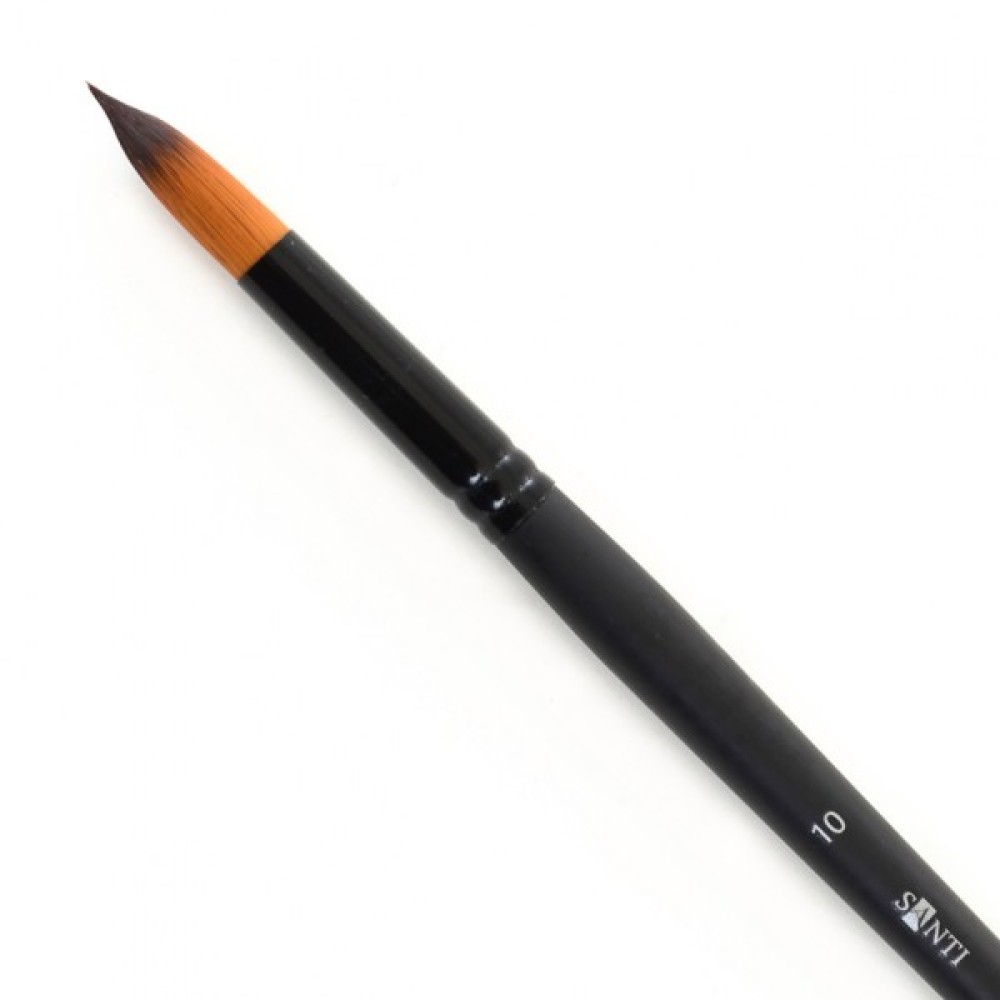 Круглі пензлі «Santi Highly Pro» відрізняються чудовою якістю синтетичного ворсу, особливою еластичністю і пружністю волосяного пучка. Представлені на довжиною ручці, захищеної матовим лаком. Дуже добре підходять для роботи з усіма видами фарби. Міцна обойма надійно зафіксована на держаку завдяки професійному клею і обтиску. Призначені як для створення фактури, так і для роботи над деталями, промальовування товстих і тонких ліній.