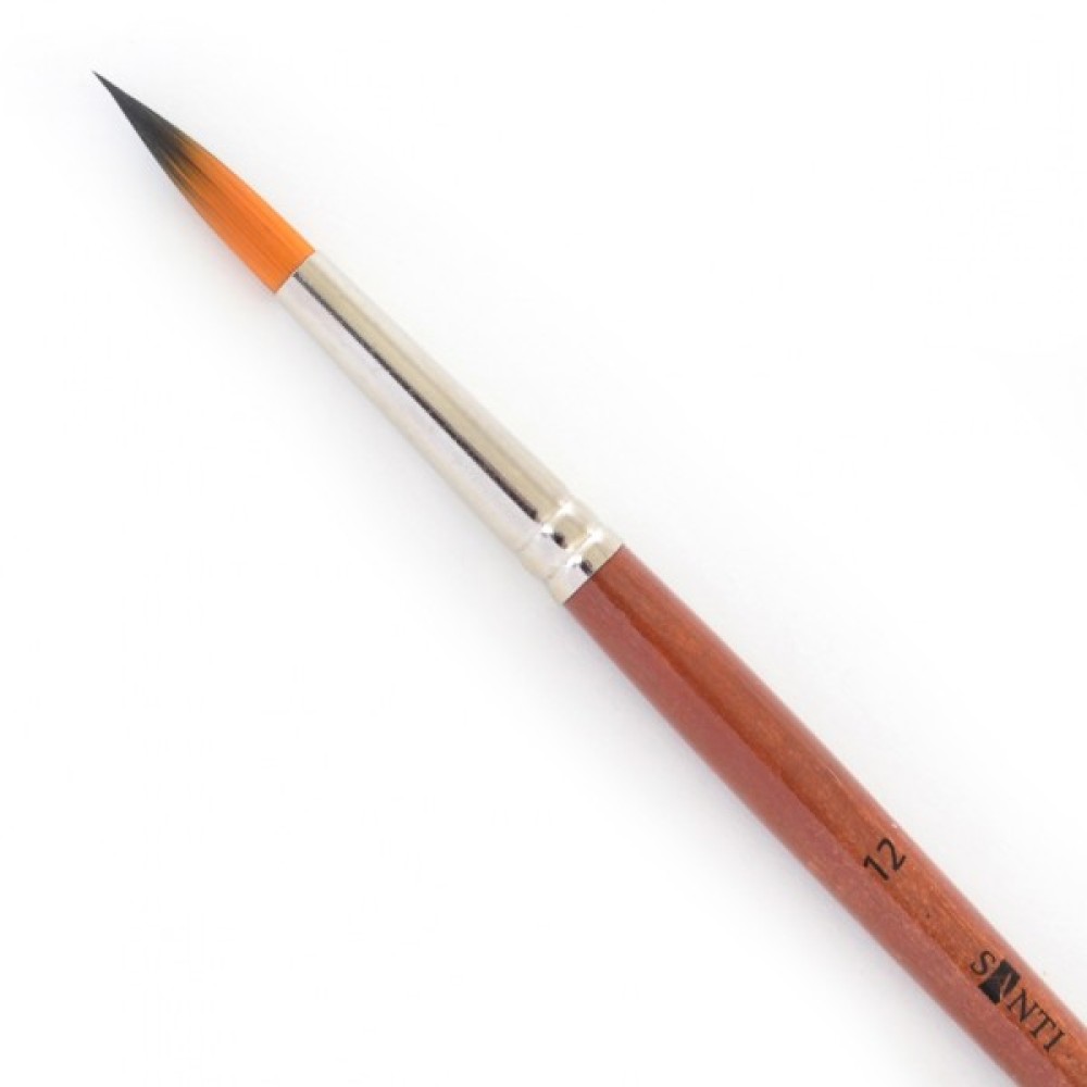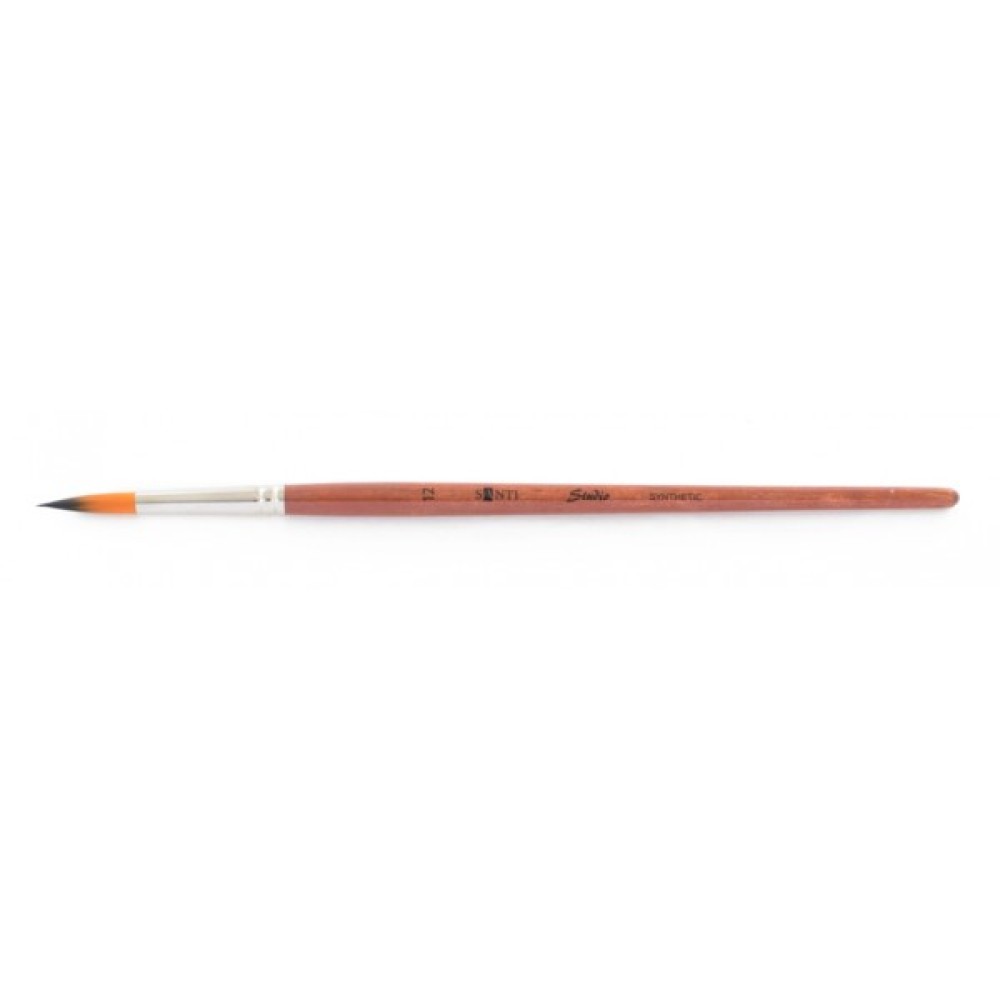 Круглі пензлі «Santi Studio» з двоколірним синтетичним ворсом і короткою ручкою будуть зручні не тільки художникам-професіоналам для деяких технік живопису, але і послужать незамінним супутником учнів і студентів. Пензлі мають високу пружністю і відмінну здатність утримувати рідину. Міцна обойма надійно зафіксована на держаку завдяки професійному клею і обтиску. Призначені як для створення фактури, так і для роботи над деталями, промальовування товстих і тонких ліній.